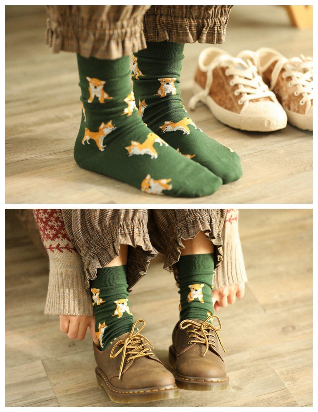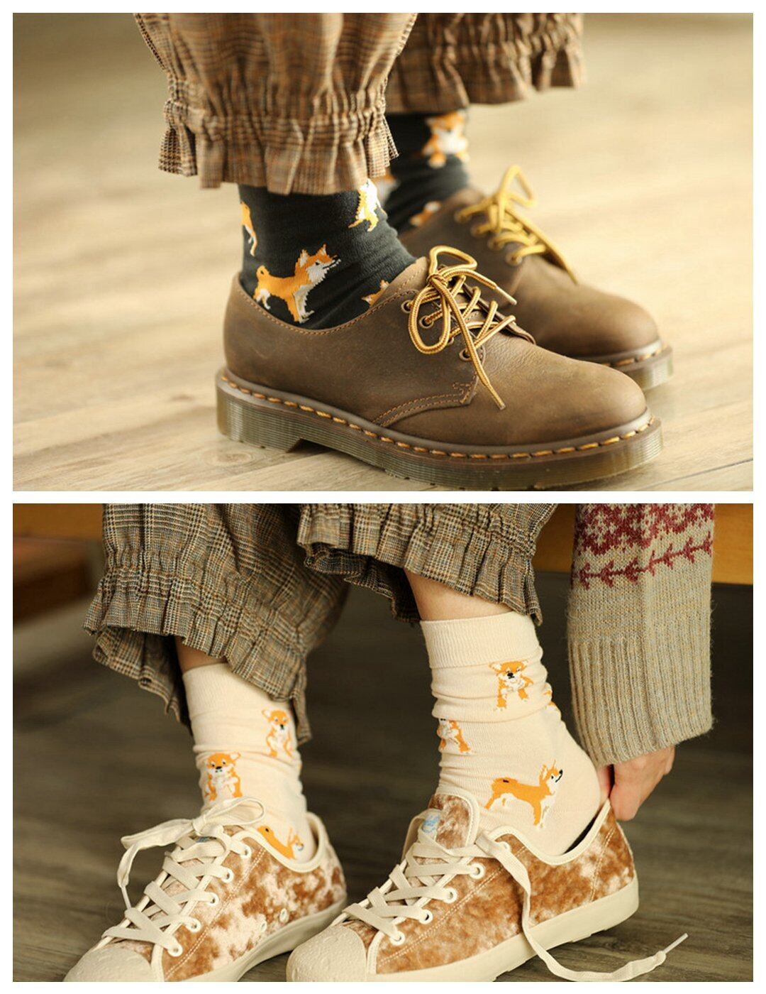 シュッとした立ち姿や、忠実にお座りして待っている柴犬がデザインされたクルー丈ソックス。
