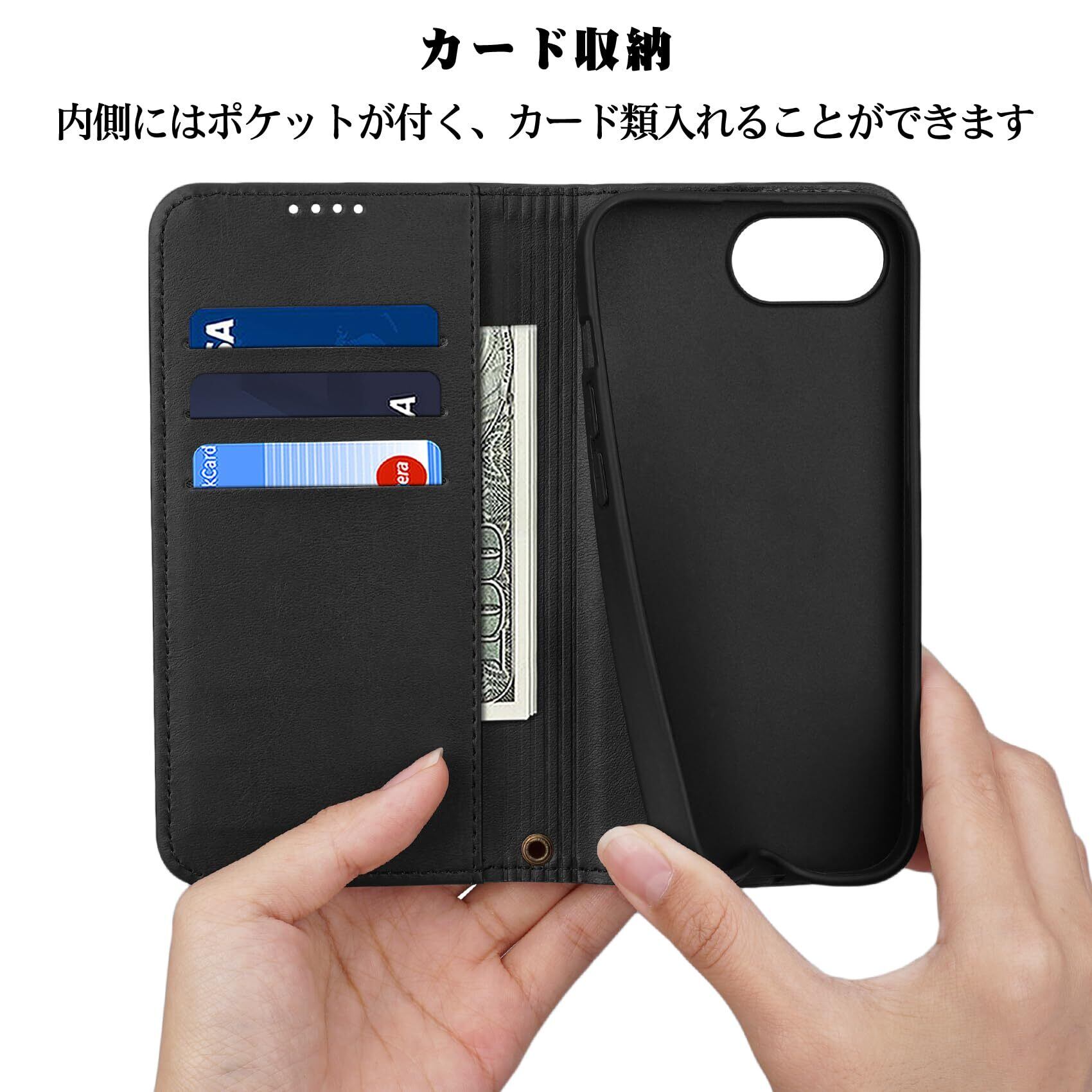 カード収納:便利なカードポケット付きのiPhone 16e 手帳型ケースです。定期券、クレジットカード、名刺などを収納でき、外出時にこれ一つで身軽に行動できます。内蔵マグネットは控えめな強度のため、カードを収納すると磁力が弱まる場合がありますのでご注意ください。