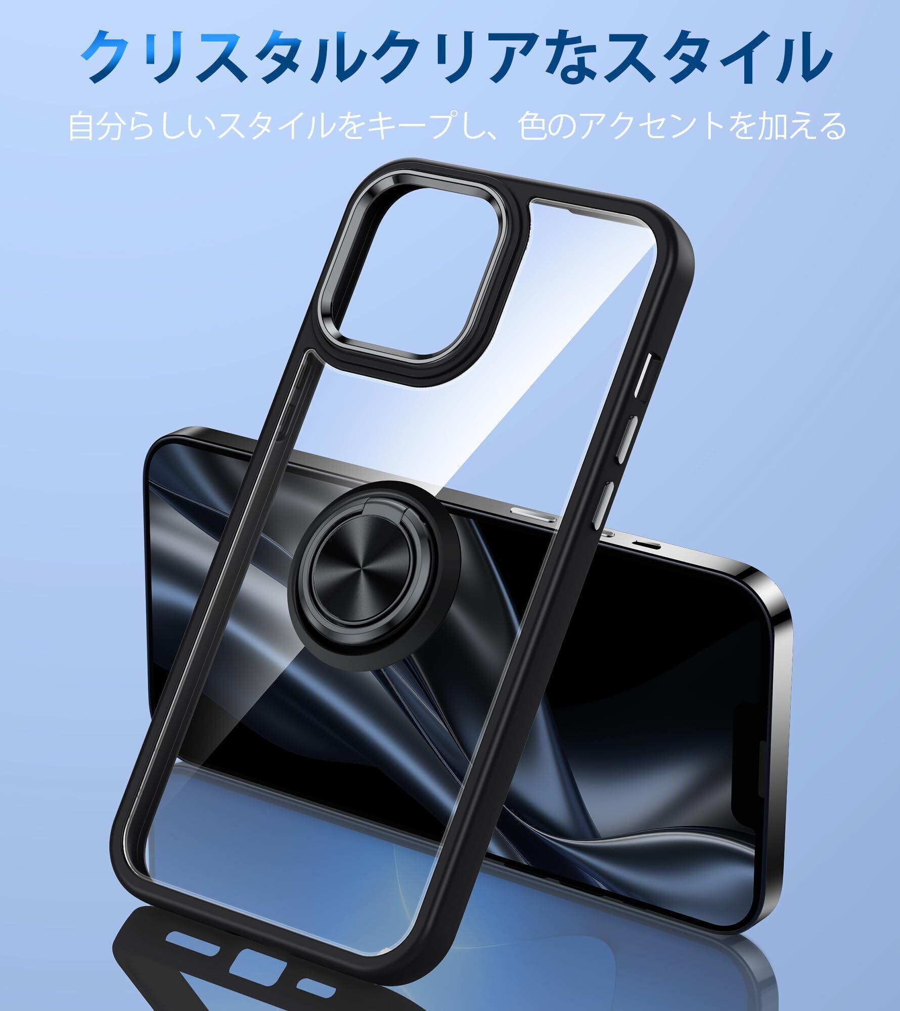 Rockaway iPhone 14 用 ケース リング付き 耐衝撃 背面クリア メッキ加工 スタンド機能 薄型 軽量 落下防止 おしゃれ カバー アイフォン14 スマホケース 6.1インチ - ブラック