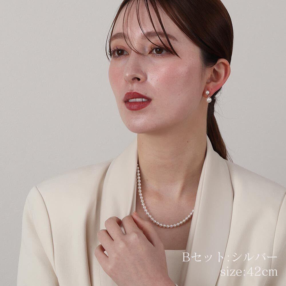 【生産国:日本】 サイズ(約)/ネックレス:100cm パール珠サイズ:5mm 素材/宝石:グランプレミアムパール(クリスタルパール) ネックレス留め具:真鍮(ロジウムメッキ)/ピアス:縦1.8cm×横1.7cm、パール珠サイズ:6mm・8mm、ポスト長さ:1cm、ポスト太さ:0.7㎜ 素材/宝石:グランプレミアムパール(クリスタルパール)、ピアスポスト:ステンレス、地金:真鍮(ロジウムメッキ)、キャッチ:シリコン