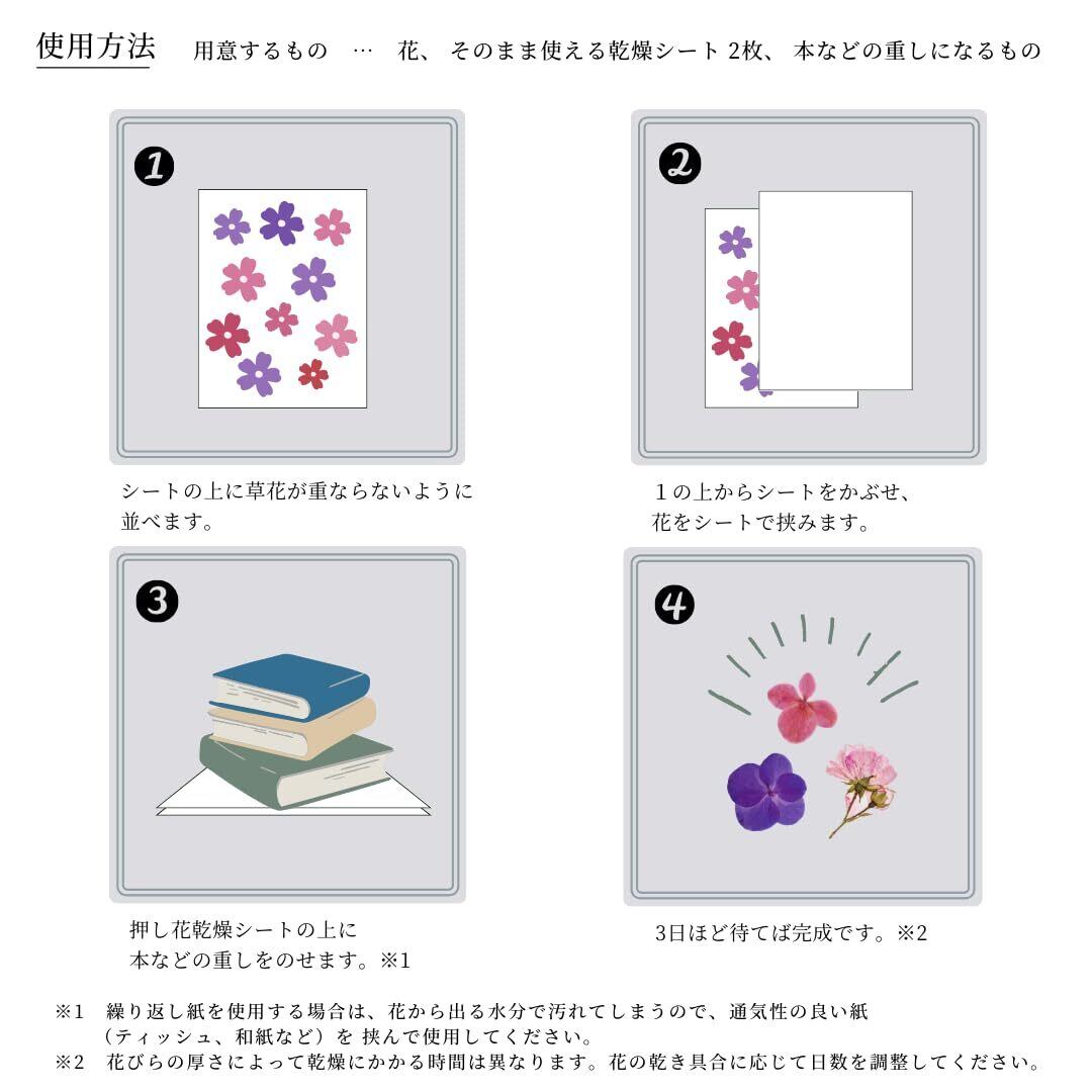 シートに関して:そのまま使える押し花乾燥シートには乾燥剤成分は含まれておりません。代わりに紙自体に高い吸水性と剥離性を備えており、再利用も可能な構造で製造しております。その構造のおかげで一般的な乾燥シートと異なり、クッションシートを使用せず簡単に押し花を作成することが可能です。