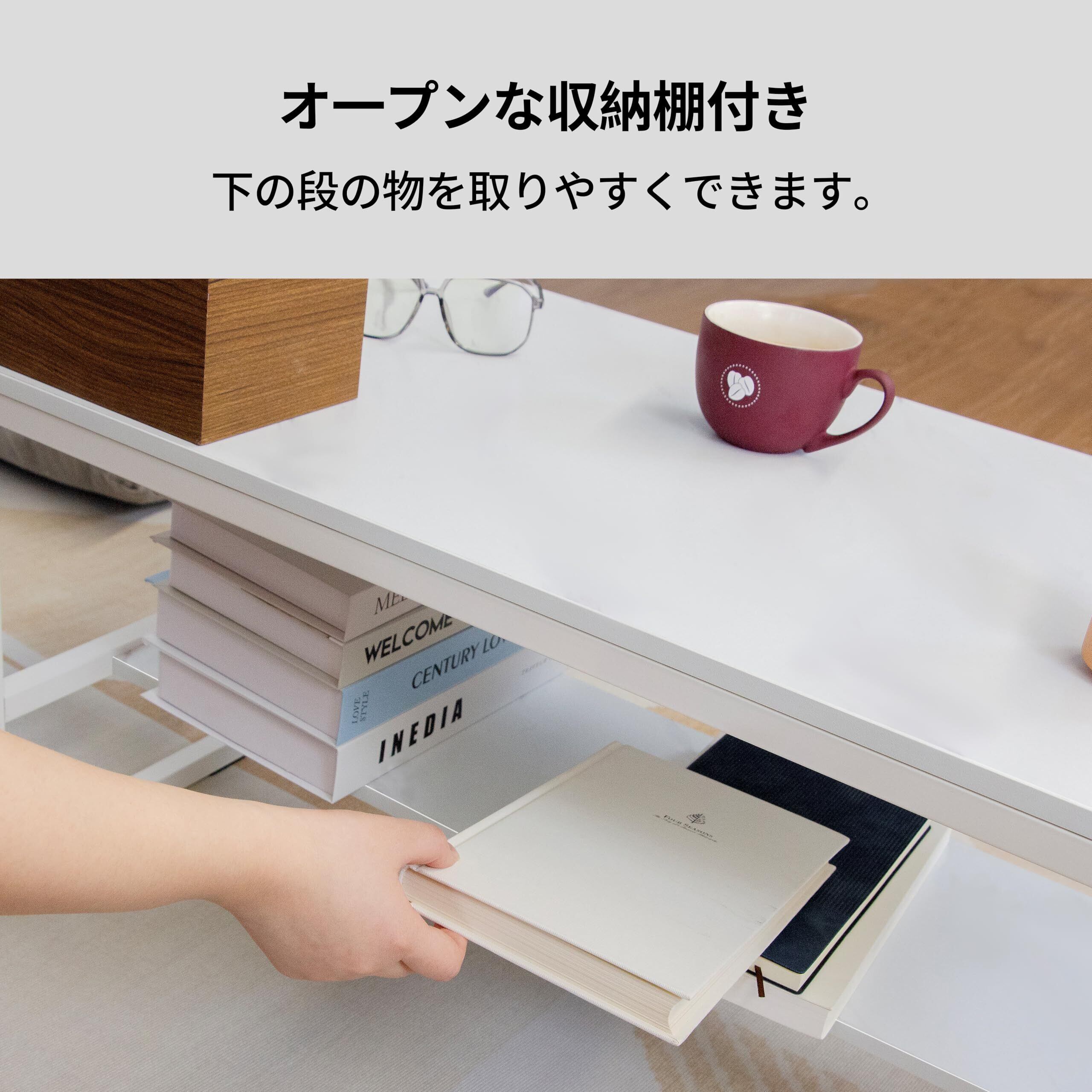 【使用場所】:ローテーブル、座卓として場所を取らずに棚板収納スペースを確保できるテーブルです。座卓使用場合でお客様の身長によって、人の脚を邪魔させないように棚板の狭さと高さを可動式に設計されています。スチルフレームと木製板の組み合わせのコンパクトデザインでワンルームが狭いと感じている方にもおすすめ。