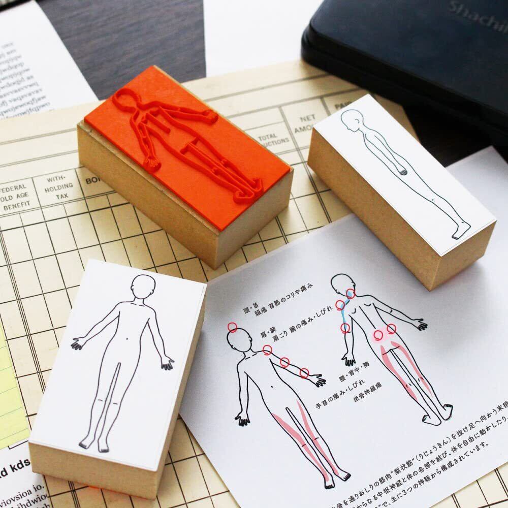 シンプルな人体図のスタンプ3個セット。前、後、横向きがセット手頃な価格が魅力です! 素材には天然ゴムとスタンプの台木には廃材や木くずなどを使用し環境に配慮しています。 シンプルな使い心地です。全て日本製で1つ1つ手作りで制作しております。 シンプルでかわいいパッケージ。プレゼントにもどうぞ。
