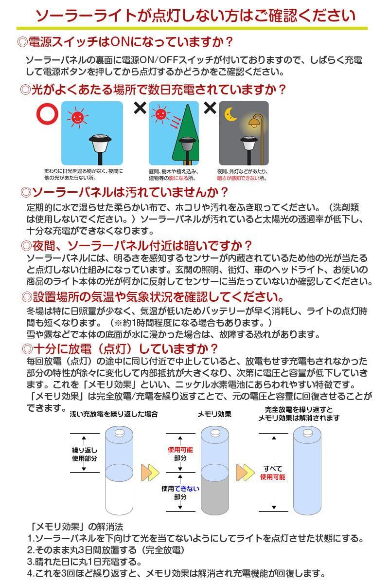 ※ソーラーパネルに光センサーが付いているので、暗くならないと点灯しません。明るい場所で点灯させたい場合、ソーラーパネルに下に向いて置いてください。