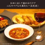 トマトのミネストローネ[原材料名] 野菜(キャベツ(国産)、たまねぎ(国産)、じゃがいも、にんじん、グリーンピース、セロリ)、トマトペースト、赤いんげん豆、チキンブイヨン、野菜だし、ミックス野菜ソテー、ぶどう糖、大豆油、コーンスターチ、ドライトマト、食塩、香辛料、(一部に乳成分・大豆・鶏肉を含む) [アレルギー物質(特定原材料とそれに準ずるもの)] 乳成分、大豆、鶏肉 [栄養成分表示(1袋/140g当たり)] エネルギー 66kcal、たんぱく質 2.1g、脂質 1.6g、炭水化物 12.1g[糖質 9.7g、食物繊維 2.4g]、食塩相当量 0.72g、カリウム 300mg ●数値は分析による推定値です。