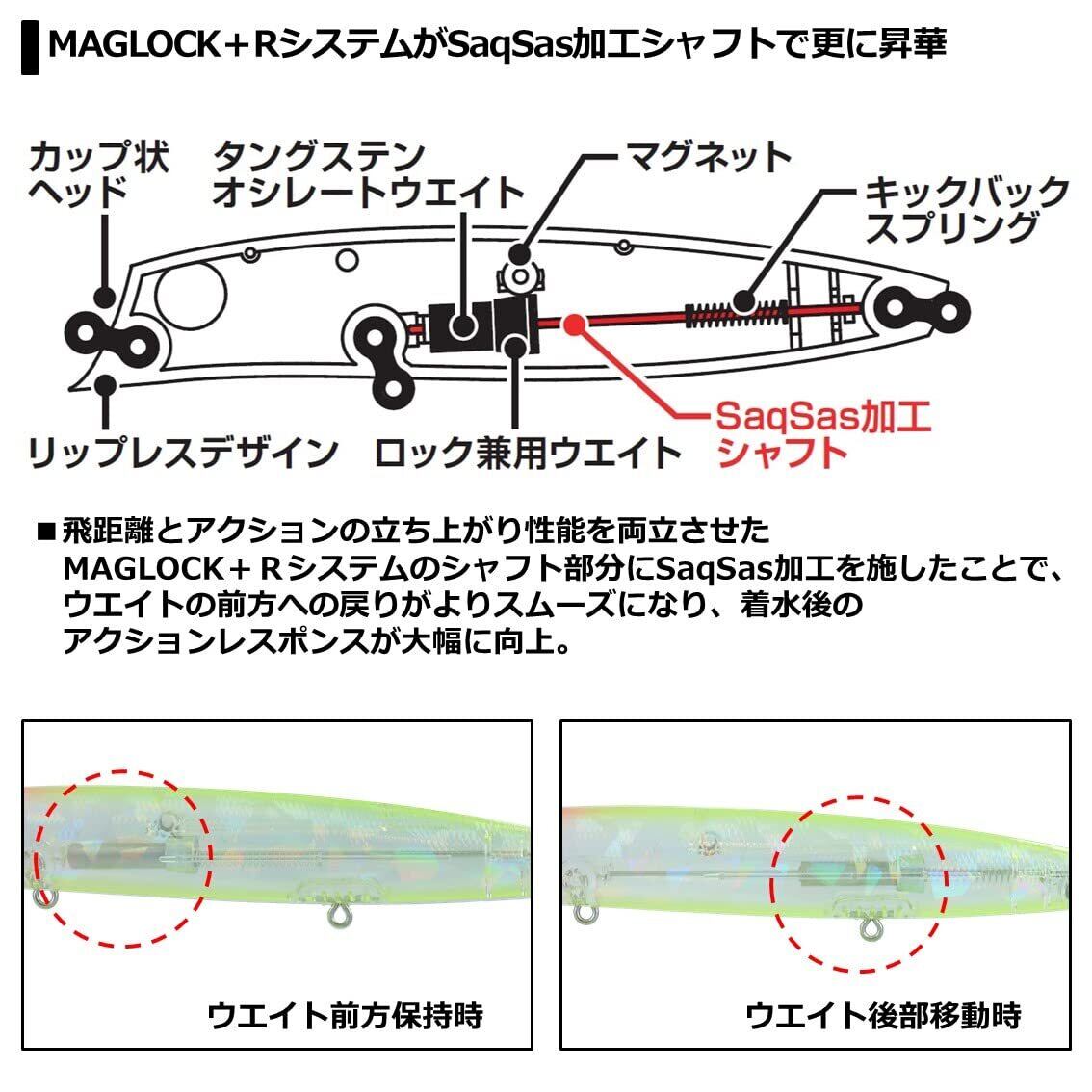 小沼正弥監修。デッドスローリトリーブ対応、高レスポンス設計。低活性・低水温期にただ巻きだけで食わす為のシャローレンジ攻略用リップレスミノー。デッドスロー対応、スローピッチフラッタリングロールアクション。幅狭スリムボディで、ヨタヨタと弱った魚の様なアクションを発生。スローピッチでおとなしいアクションによりスレたシーバス、エリアに対応。こだわりのバランス設定により、感度も高く、タダ巻きだけで流れの境目やヨレで自動的にフラッとバランスを崩し軌道変更するためそれが食わせの間となります。MAGLOCK+Rシステムのシャフト部分をSaqSas加工した「MAGLOCK Ver.S+R」の搭載により、飛距離のロスを最小限に抑えつつウエイトの戻りが大きく向上。カップ状のリップと相まって着水後のリトリーブで速やかにアクションが立ち上がる上、デッドスローリトリーブのレスポンスも秀逸。