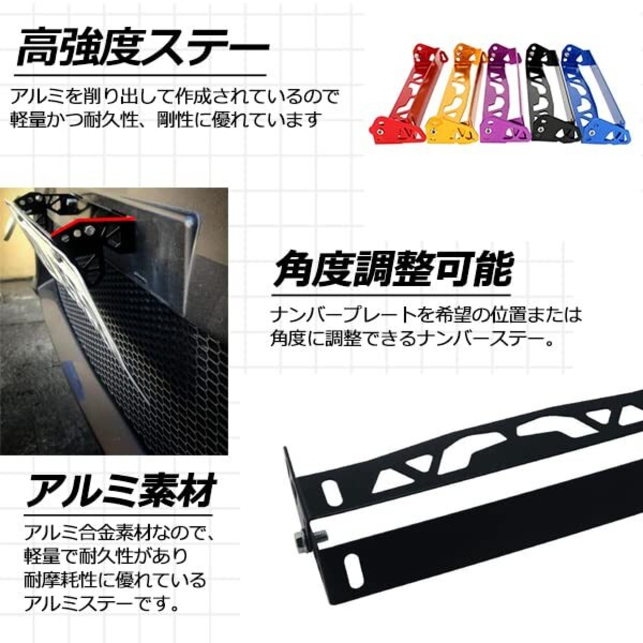 〇高級感のある汎用のヘッドライトステー。 〇汎用タイプ:車や軽自動車に簡単に取り付けられる汎用タイプ。 〇角度調整可能:ナンバープレートを希望の位置または角度に調整できるナンバーステー。 〇アルミ素材:アルミ合金素材なので、軽量で、耐久性があり、耐摩耗性に優れている、 アルミステーです。 〇商品情報 ■重 量:150g ■サイズ:24.5cm×5cm ■厚度:2mm ■材質:アルミニウム合金 ■カラー:ブラック/シルバー/ブルー/レッド/パープル/イエロー 6種類のカラーからお選び頂けます。