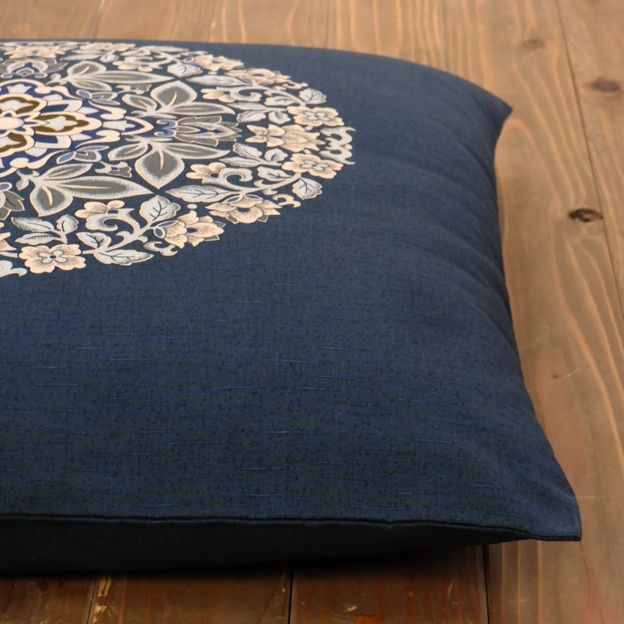 落ち着いた柄で人が集まることが多い場所にぴったりの座布団カバーです。