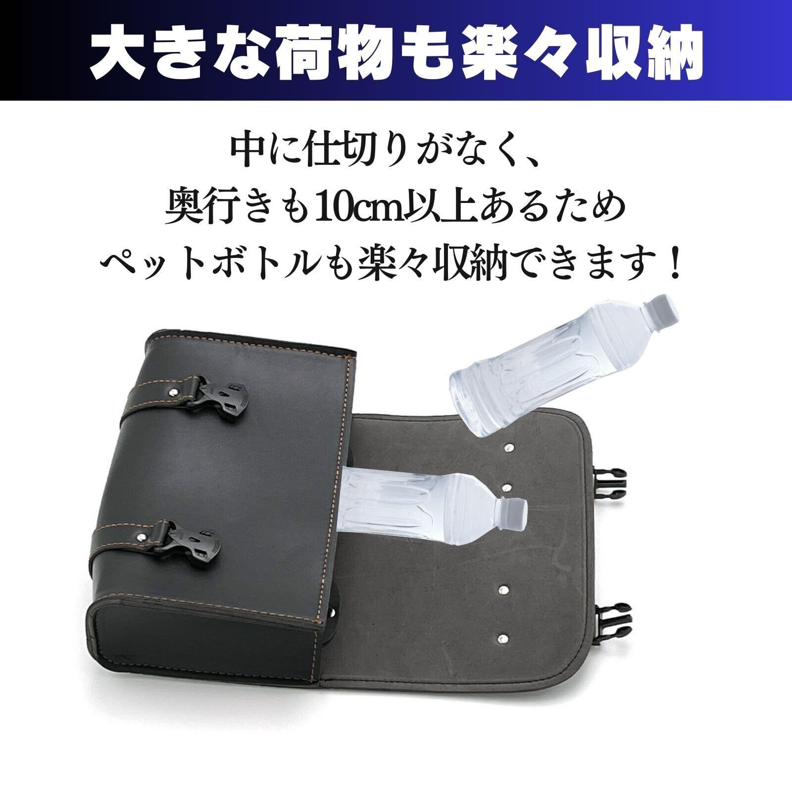 おしゃれなデザインと機能性を兼ね備えたバイクサイドバッグ 高級感あふれるシンプルなデザインが、どんな車種にもマッチします。縦横自由に設置できる付属ベルトで、バイクに合わせてアレンジ自在です。 大容量収納と使いやすさ 仕切りのない広々とした内部には、ペットボトルや工具、雨具などの日常必需品をたっぷり収納できます。 防水加工で安心の雨対策 防水加工された素材で作られており、雨の日も安心してご使用いただけます。(大雨の際には上蓋の隙間から雨水が侵入する可能性があります。) 高耐久性と信頼の品質 亜鉛合金製の錆びにくい金具としっかりした縫製で、耐久性も抜群。PU素材は撥水性に優れ、本革よりお手入れが簡単です。 サイズとセット内容 本体サイズ:幅28cm×高さ21cm×奥行10.5cm ベルトサイズ:長さ29cm×幅2.7cm 容量:15L 重量:約500g バイクツーリングの必需品 ネイキッドバイクやアメリカンバイク、ハーレー、レブル、クロスカブなど、さまざまなバイクに対応します。
