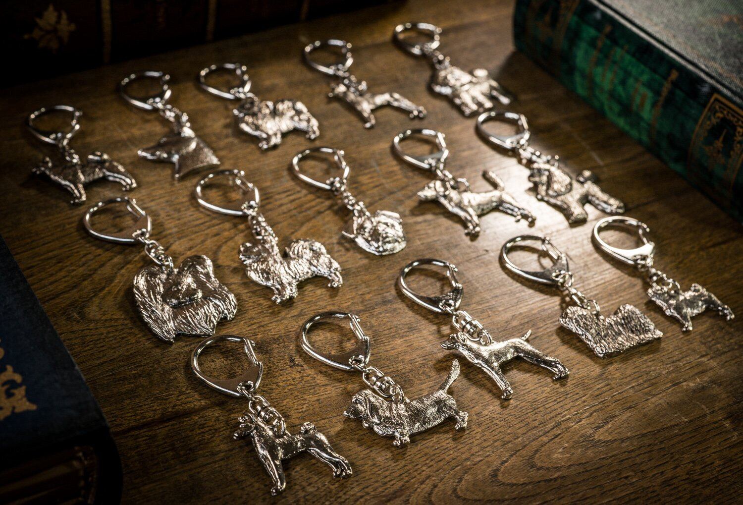 製品の多くは当時のイギリスのデザイナー職人の手によってデザインされ、どの犬種のアイテムもとても精巧で芸術的センスの高い本格的な造りとなっていて、品のあるシルバー色、ゴールド色を帯びたこれらの製品は どの毛色の犬の飼い主様であっても 違和感なく使う事ができると 本国であるイギリスでは高い人気を誇っています。