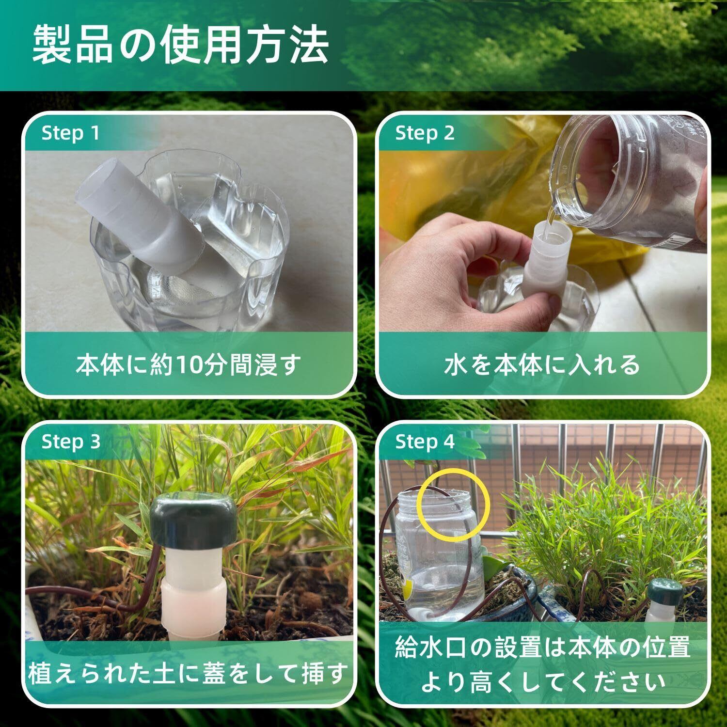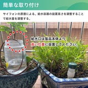 【簡単操作・便利設計】複雑な設置は必要ありません。お好きなボトルに水を入れ、キャップをボトルの口に、そして土壌に挿入するだけ。流量調節バルブで給水量も自由自在です。