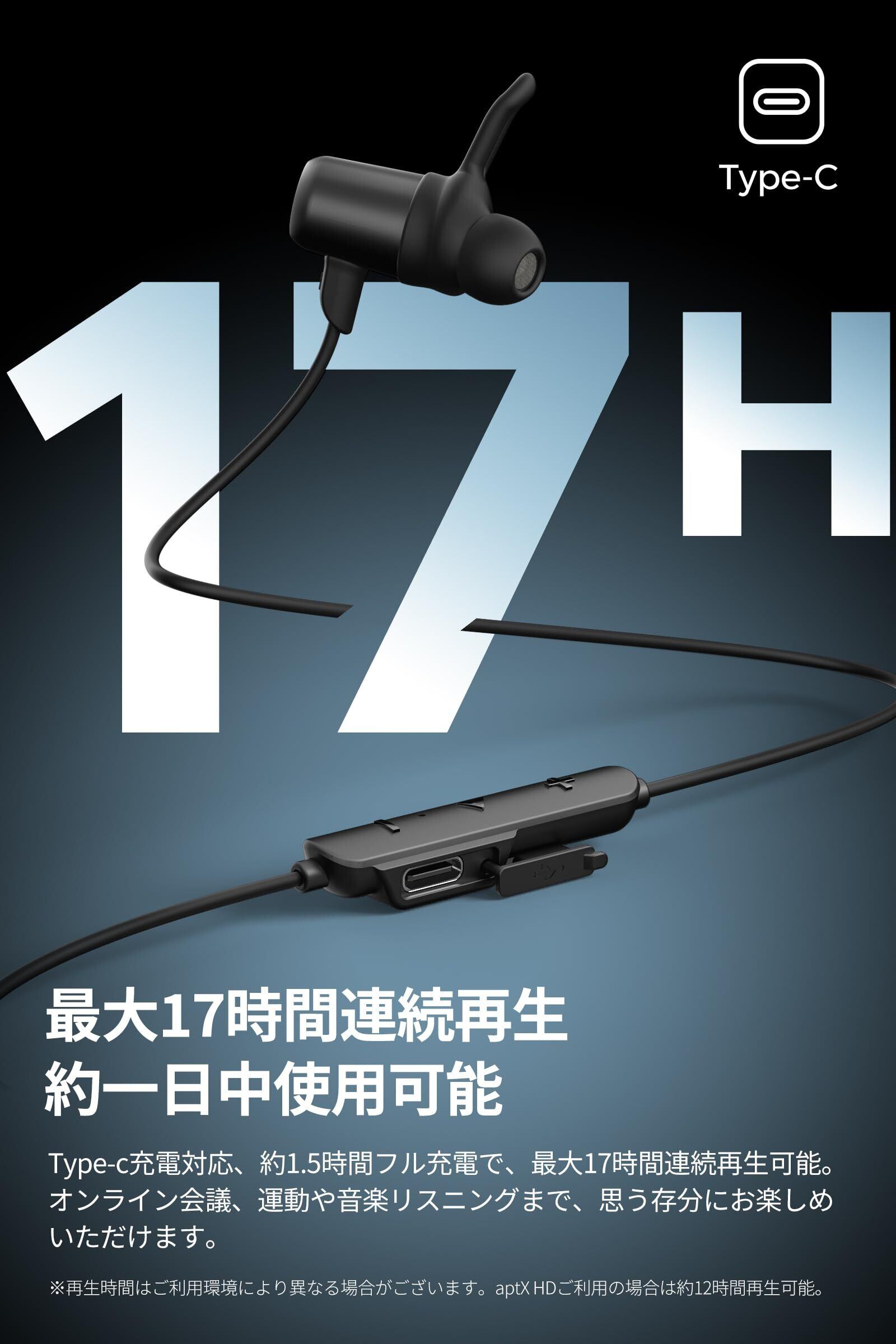 【最大17時間連続再生、TYPE-C充電も対応】:最大17時間の連続再生が可能で、自宅での音楽鑑賞、通勤通学、ランニング、ハイキングなど、様々なシーンに適用され、17時間連続再生で約1日中使用してもバッテリー切れを心配する必要がありません。Androidデバイスと同じType-C充電に対応しており、充電端子の上下を問わず非常に便利です。最高に充電も速く、1.5時間でフル充電できます。※再生時間は音楽再生時間であり、音量、再生内容、使用環境より異なる場合がございます。aptX HDの場合は約12時間再生