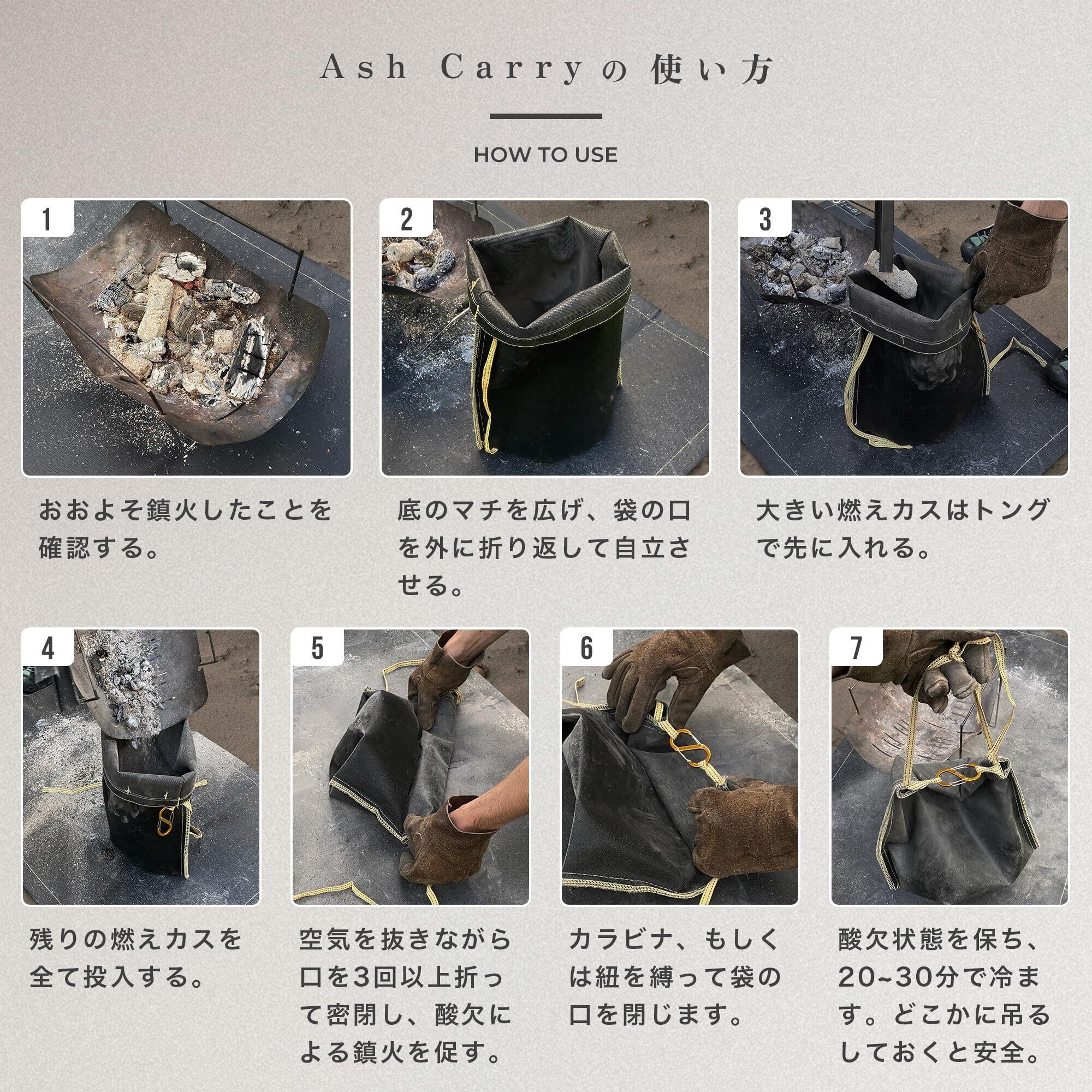 カラビナ付属モデルです! 【炭や燃えカス処理の悩みを解決!】アッシュキャリーは使用後の炭や薪の燃えカスを安心安全に持って帰れる耐熱性・難燃性の生地で作られた、火消し袋です。折りたたみ収納可能でコンパクトで携帯性が高く、今やアウトドアに必須のアイテム!キャンプやバーベキュー等焚き火終了後に完全に消化し、薪や炭を持ち帰れます。マチ付き自立型で耐熱性素材で作られており、まだ少し熱を持った使用後の炭や薪の燃えカスを入れたら、袋の口を締め内部を酸欠状態にする事で、緩やかで完全な鎮火を促し、安心安全に炭を持ち帰る事ができる炭処理火消し袋です。