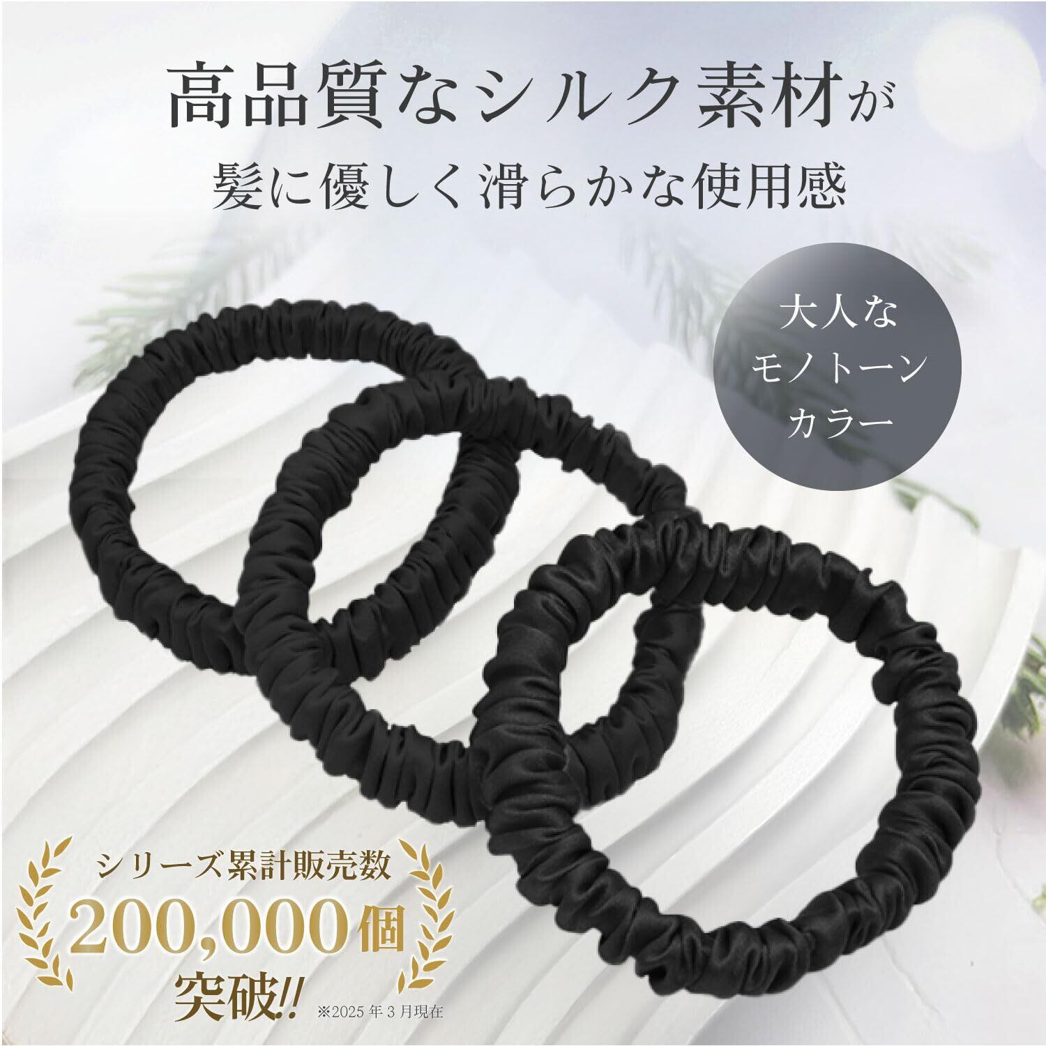 シルク ヘアゴム 3個セット 跡がつかない 天然シルク100% 大人 ダメージレス 髪に優しい シュシュ 髪ゴム 髪留め アソートB (ブラックx3)