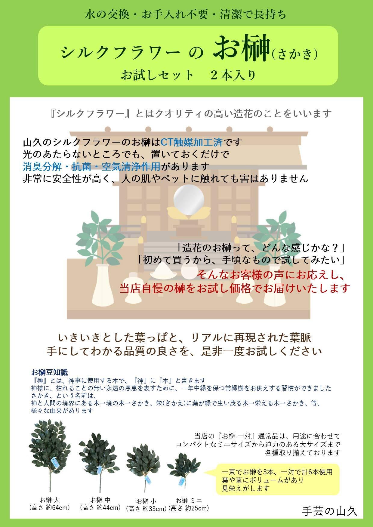 山久 榊 造花 シルクフラワーのお榊 お手頃お試しサイズ 一対 2本入り 神棚用 約34cm CT触媒(消臭分解・防汚作用)加工済