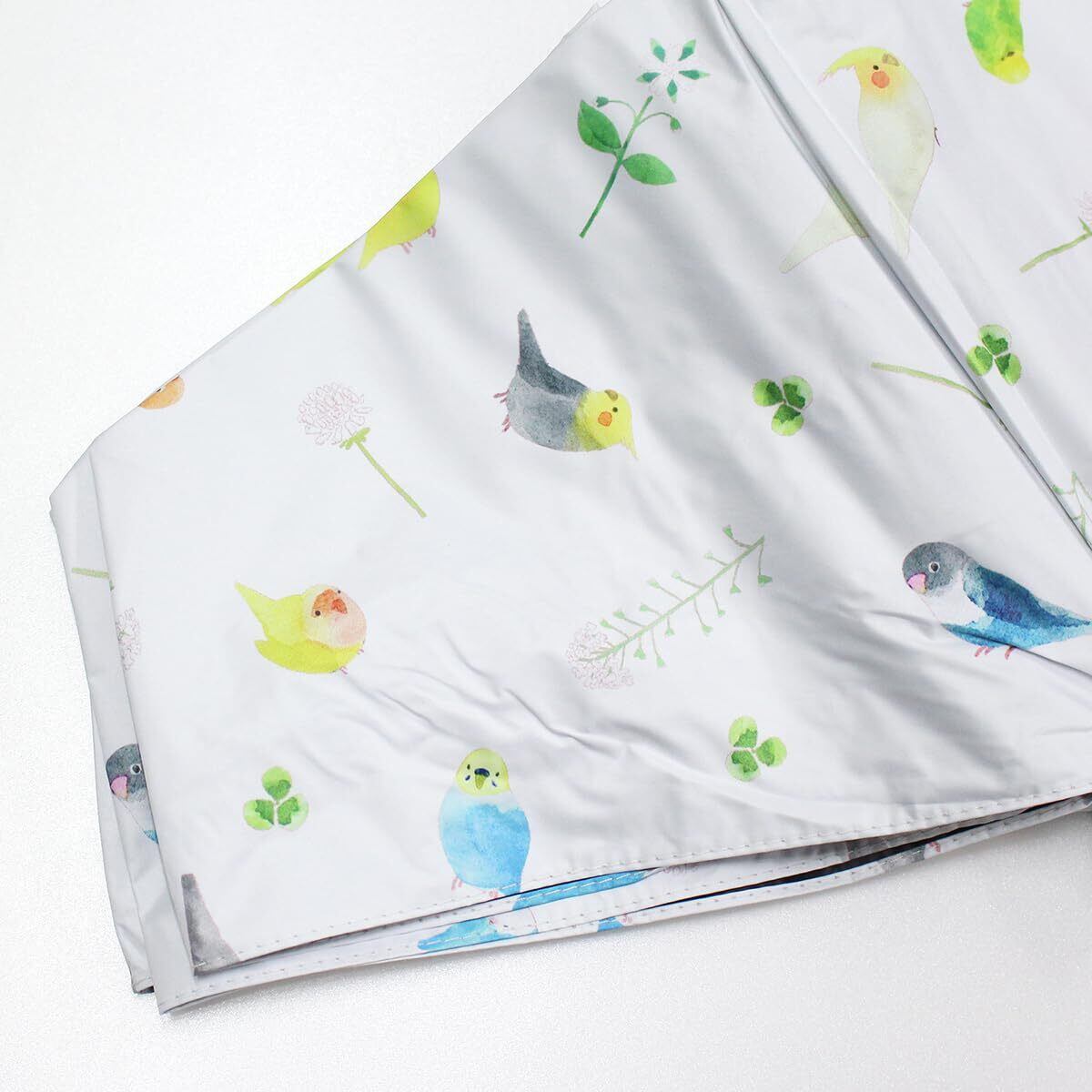 色とりどりの小鳥たちと春の野草が一緒に描かれています。ペットとして人気のセキセイインコ、オカメインコ、コザクラインコ、ボタンインコのかわいい仕草と表情に癒されるアイテムです。雨傘としても日傘としても使えるので、いつでも小鳥たちと一緒にお出かけできます。裏側のポリウレタン加工の色はブラックになっています。ダークな色は光を吸収し日陰を作る効果があります。