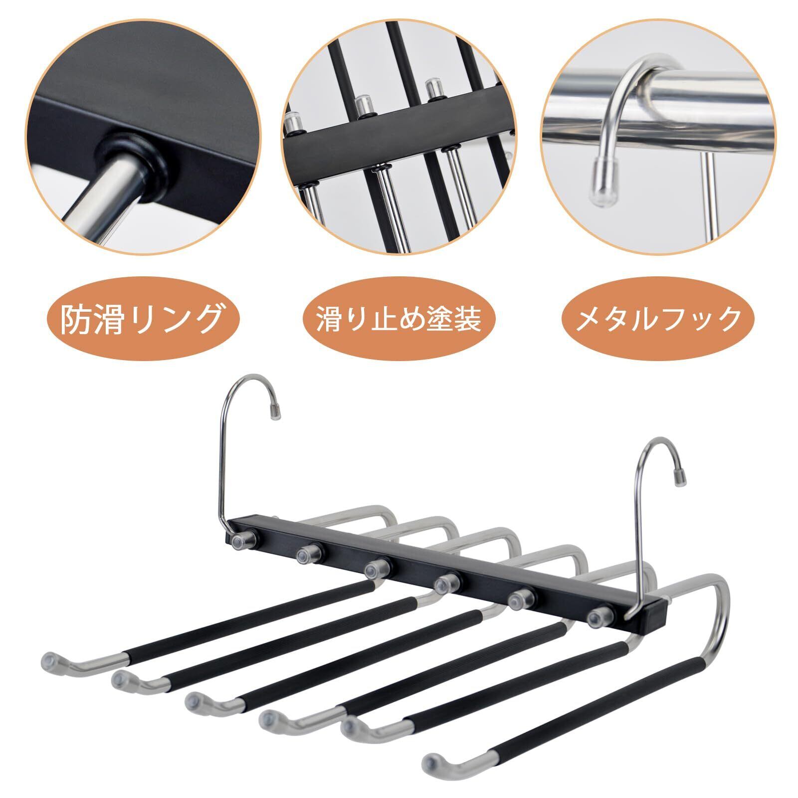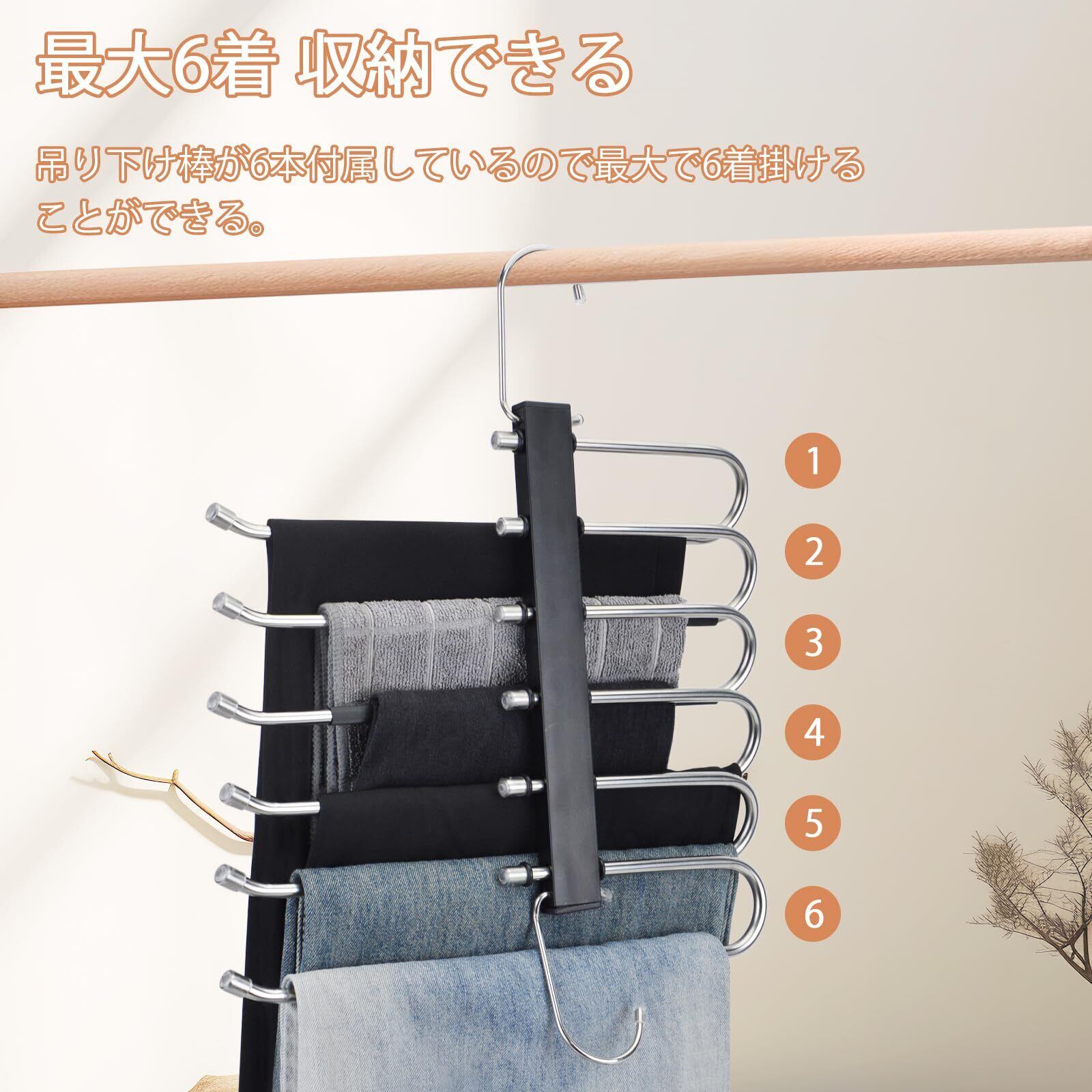 【滑り止めハンガー&上質な素材】高品質の防錆ステンレススチールと高品質のABSプラスチックで作られています。ハンガーが歪まず、安心して使用できます。スペースセービングパンツハンガーの最大耐荷重は6本のパンツに対応しています。掛けた服の落下を防ぐ6つの滑り止めのゴムカバー先端に付いており、安定性を高めて、ズボンをより安定に掛けられます。