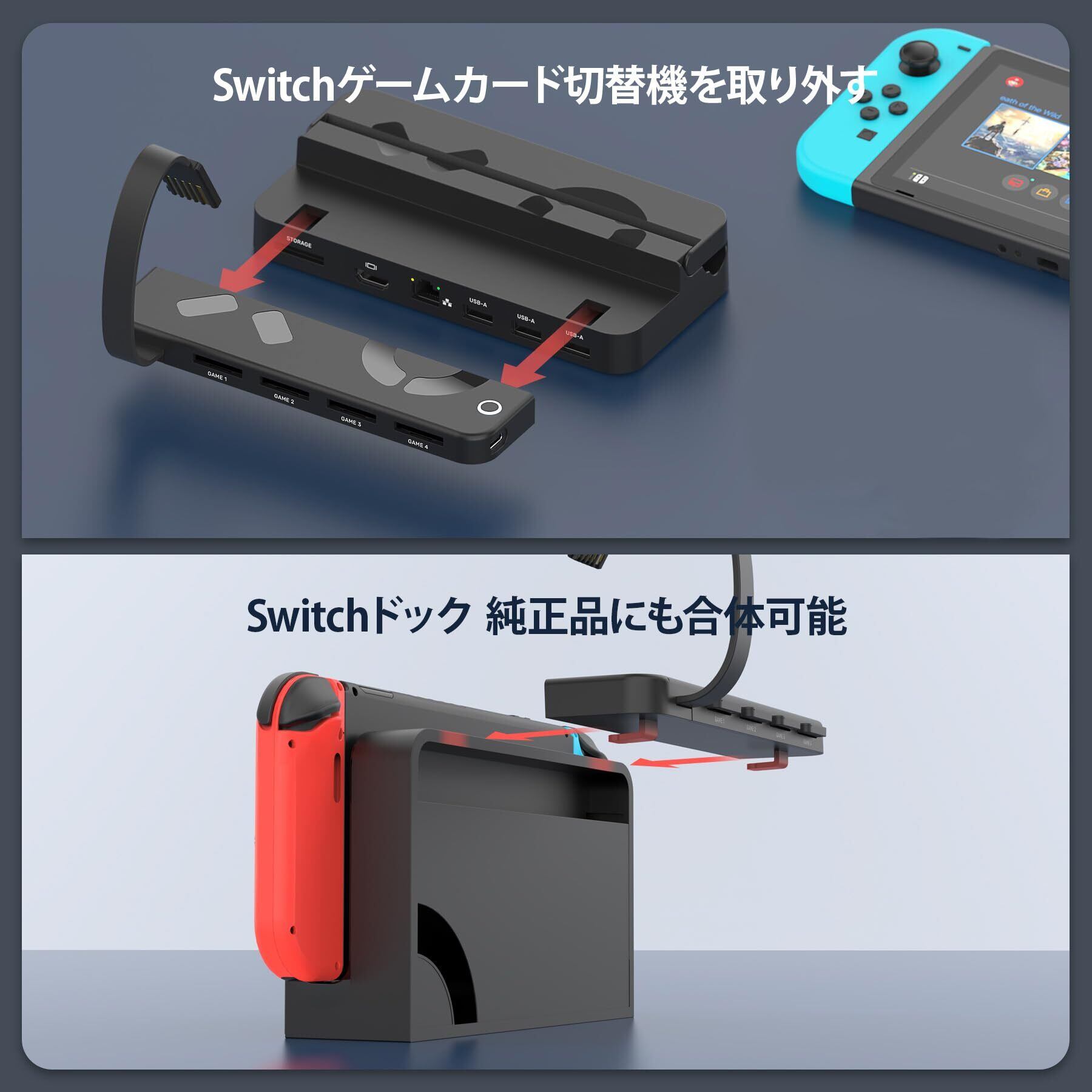 【switchゲームカード切り替え】Unitek G1002BはNintendo Switch/ Switch OLED専用で、4枚のカードを同時に挿入して読み取ることができ、1つのボタンで複数のゲームを素早く切り替えられます。ゲームカードを頻繁に繰り返し挿入することを避けることができます。専用ドライバのインストールが不要なので、初心者の方でも簡単に扱えます。(Switchドックは含まれています)。