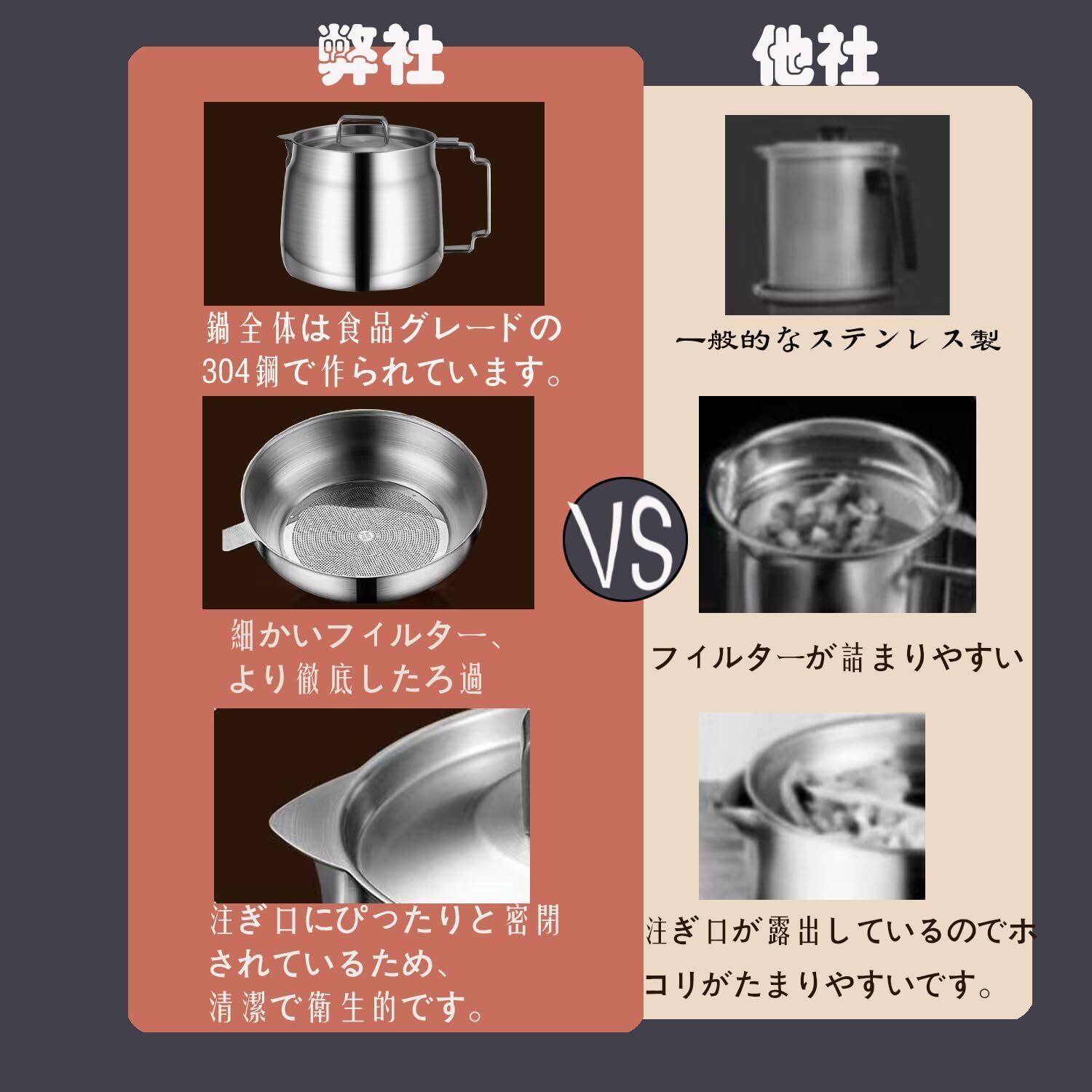 1.高品質:オイルポット本体とオイルフィルターは食品グレードの304ステンレス鋼で作られており、酸化防止、耐腐食、防錆、油垂れ防止、衛生的で劣化しにくいです。 耐久性があり、お手入れが簡単です。