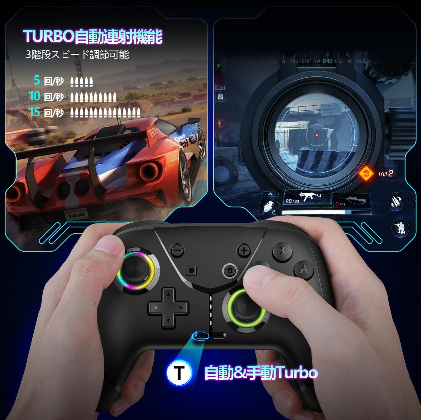 【Turbo連射機能&4段HD振動機能】switchライトコントローラーはTURBO連射機能を搭載し、ゲームに応じて連射機能(5回/秒、10回/秒、15回/秒)を設定できます。その他、自動連射機能もあり、一回押すだけで圧倒的な攻撃ができ、勝率を上げることができる!Switchプロコンは内蔵振動モーターを搭載し、4段階振動調整機能(0%/30%/70%/100%)を提供され、アクションに合わせて振動を調整することができます。これに加えて、PCコントローラーは9色変換RGBライトを搭載し、ゲームプレイ中の雰囲気を盛り上げ、没入感のあるゲーム体験を提供します。