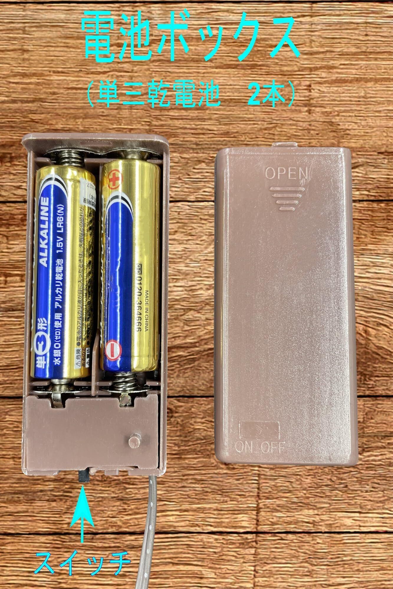 材質:花ビラは布製、枝は針金とビニール、LEDと配線、電源ボックスはプラスチック