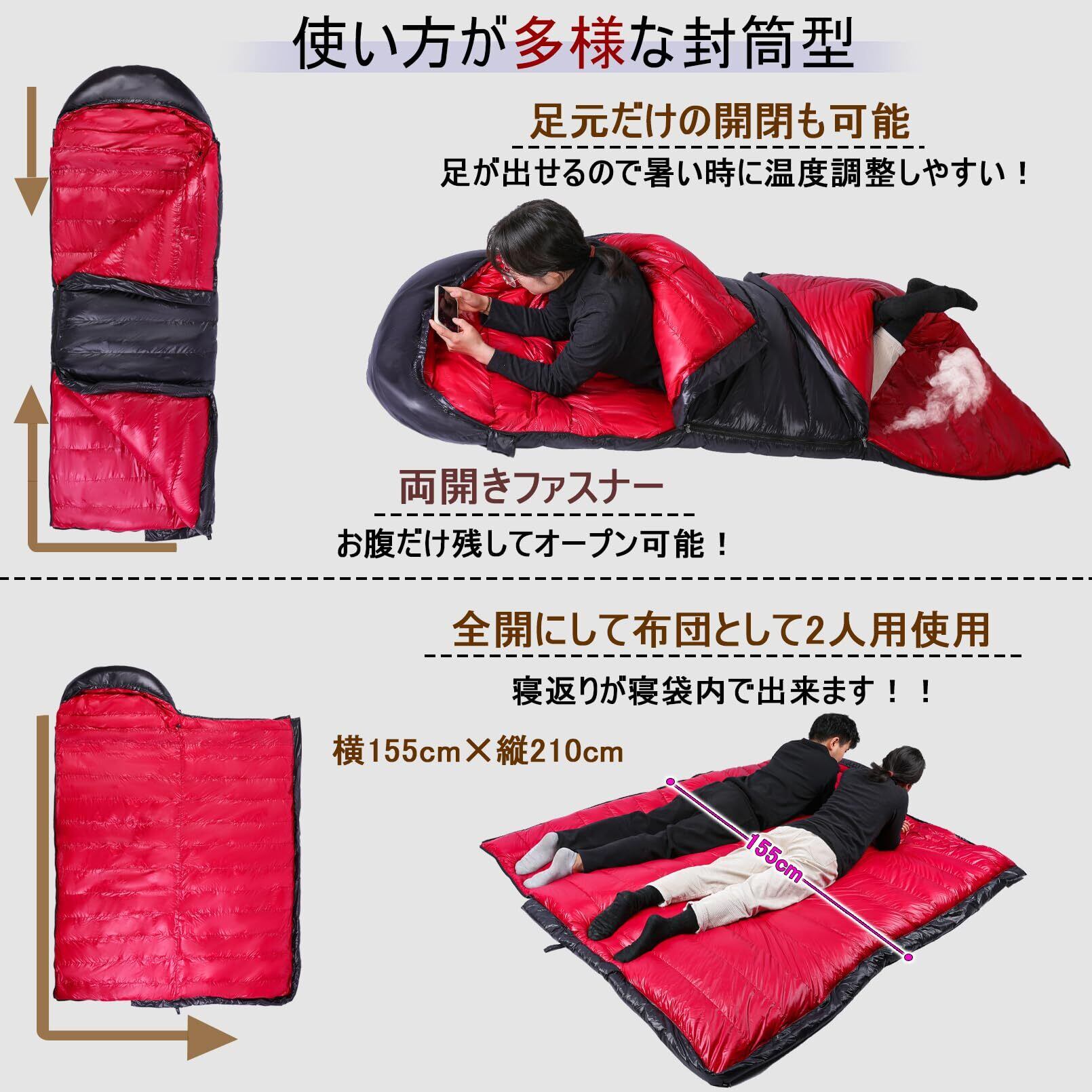 【多用途】暖かさが朝まで持続する優れた保温性を持つダウン寝袋。キャンプやアウトドアはもちろん、車中泊や自宅での布団、防災用など、様々ななシーンで大活躍!