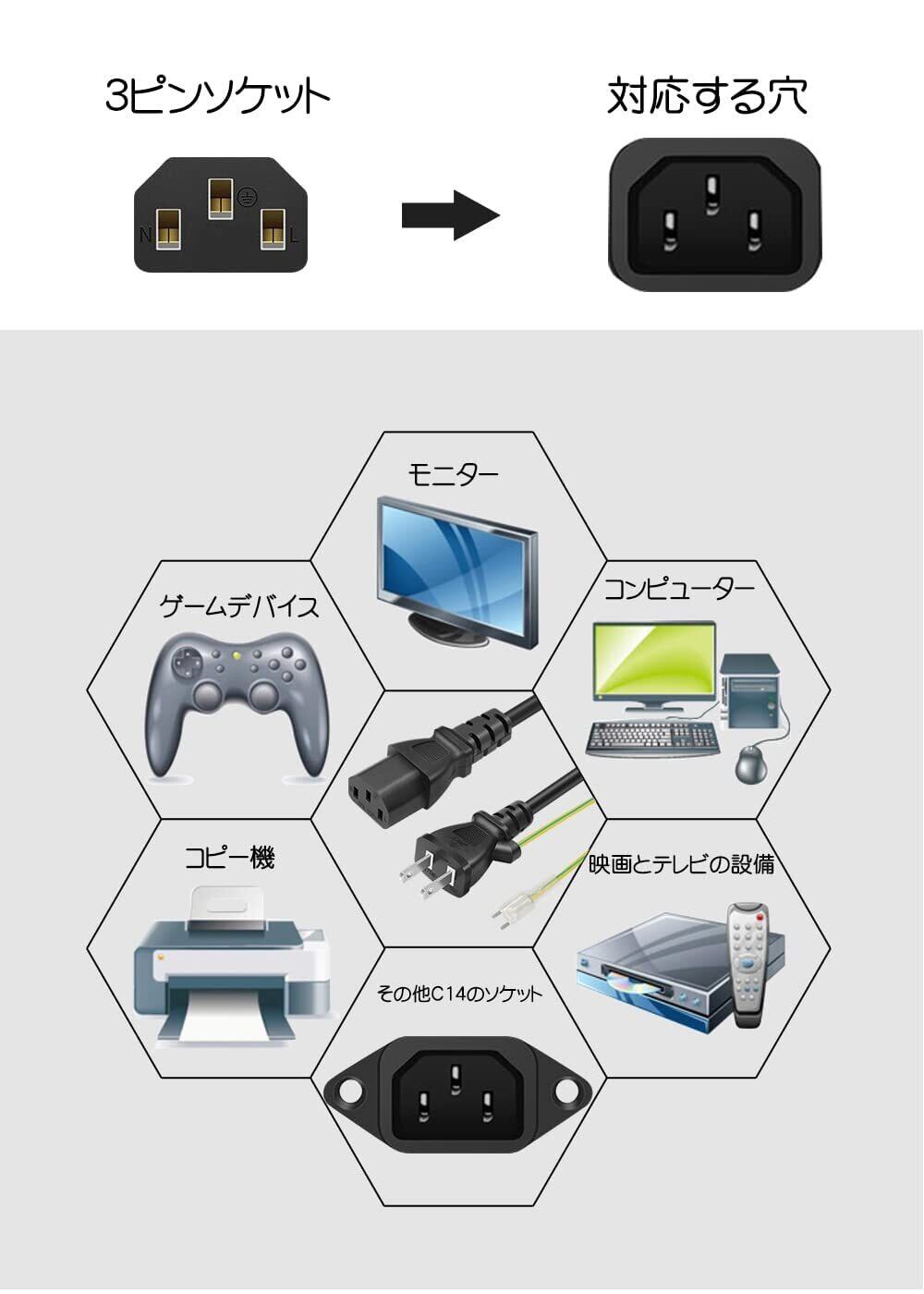 【コネクター形状】ACアダプター側:3ピンソケットC13(メス)、ACコンセント側:2ピン(アース線付き)プラグ(オス)。ケーブル長:2.0m,アース線の長さ:15cm。重要な電源の入れ替わっ線として、3ピンプラグのモニター、コンピューター、ゲーム機、コピー機、プリンターなど家用電器には適用します。