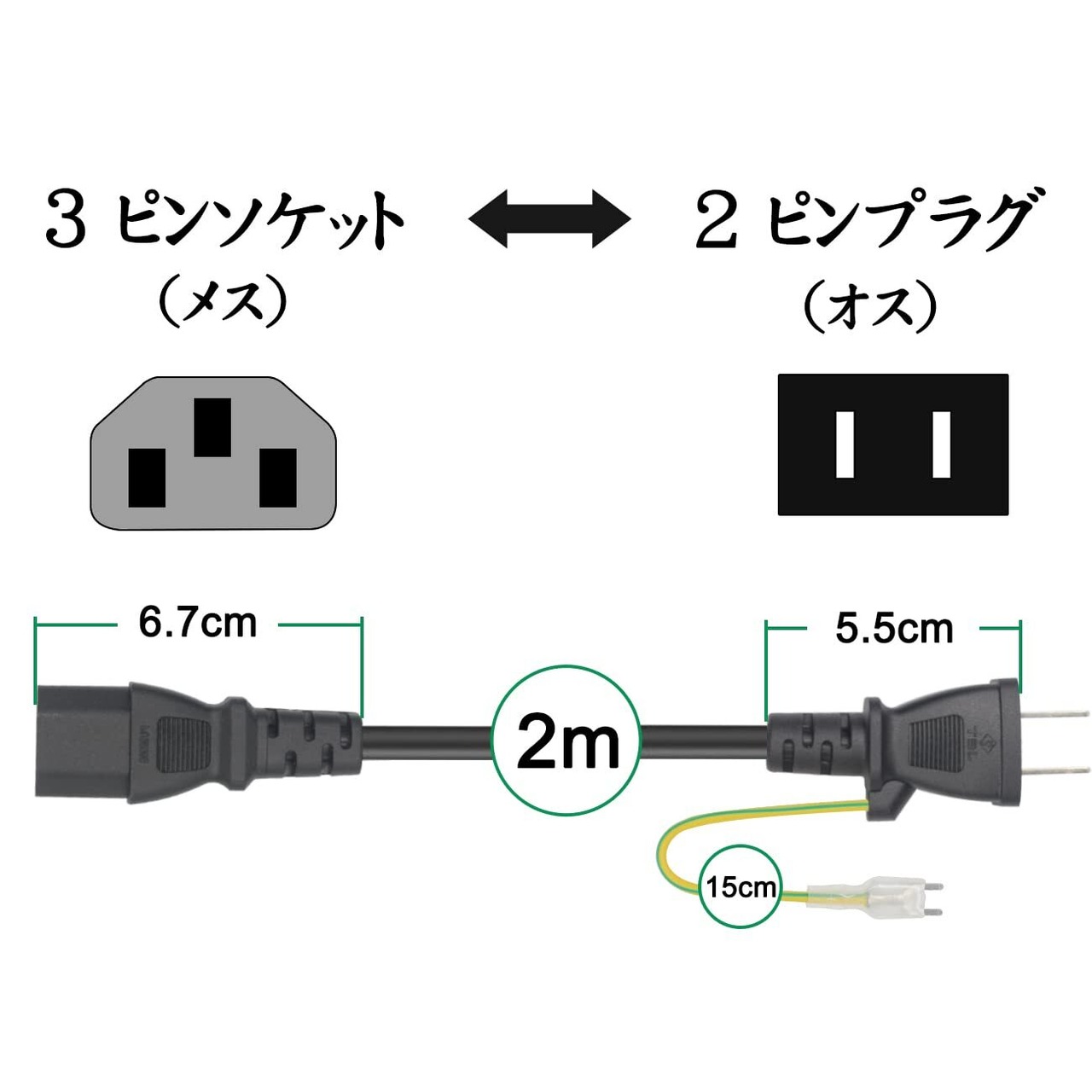 FUNZUR AC電源ケーブル 電源コード 2m (PSE規格品) パワーコード 変換 3P-2P 3ピンソケット(メス)⇔2ピンプラグ(オス) (アース線付き) 純銅質線芯:3×0.75 mm2 定格7A-125V | yankees