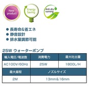 【規格】入力電圧:AC 100V/60Hz 電力:25W 最大揚程:1.8Mぐらい 吐き出し口外径:13mm&16mm 最大流量:1500L/H 騒音クラス:40デシベル以下 電源コードの長さ:1.9M
