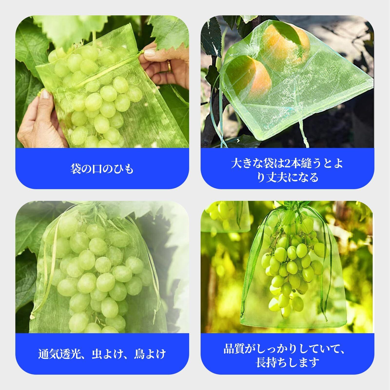 【害虫鳥避け】:果物保護バッグはミバエ、鳥、カラスを防ぐことができます。庭に大切な野菜や果物保護に用いて、手間かかりません、貴重な果物や野菜は害虫からの侵害を防ぎます。丁寧に植えられた果実を虫や鳥から守る防虫ネット。 このタイプはメッシュのテグスが太くしっかりしており、袋状に被せることができるタイプで、効果バツグンでした。