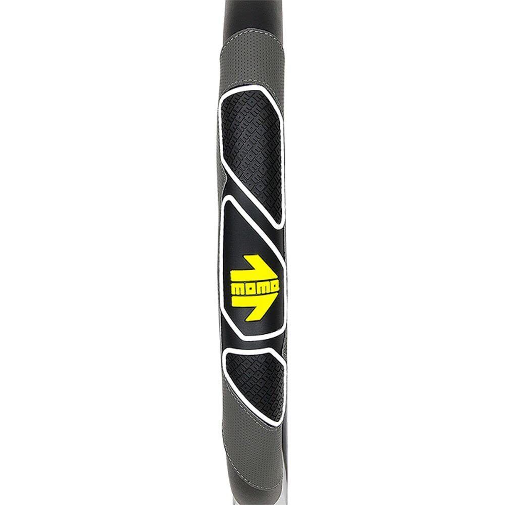 レザー生地×パンチングレザー生地。グレーカラーのパンチング生地にMOMO滑り止めグリップを取り付けている。センターマークはイエローを使用。