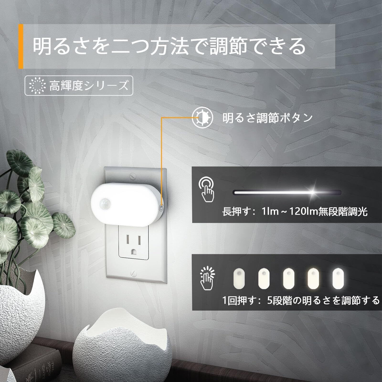 【広い調光範囲+無段階調節】長押すと1ルーメンから120ルーメンまで無段階調光することができます。1回押すと、明るさを5段階調節できます。暗いところで目を保護するだけでなく、明るいところで十分な照明を提供することができます。※ご注意:最小/最大の明るさになるとセンサーライトが点滅します。