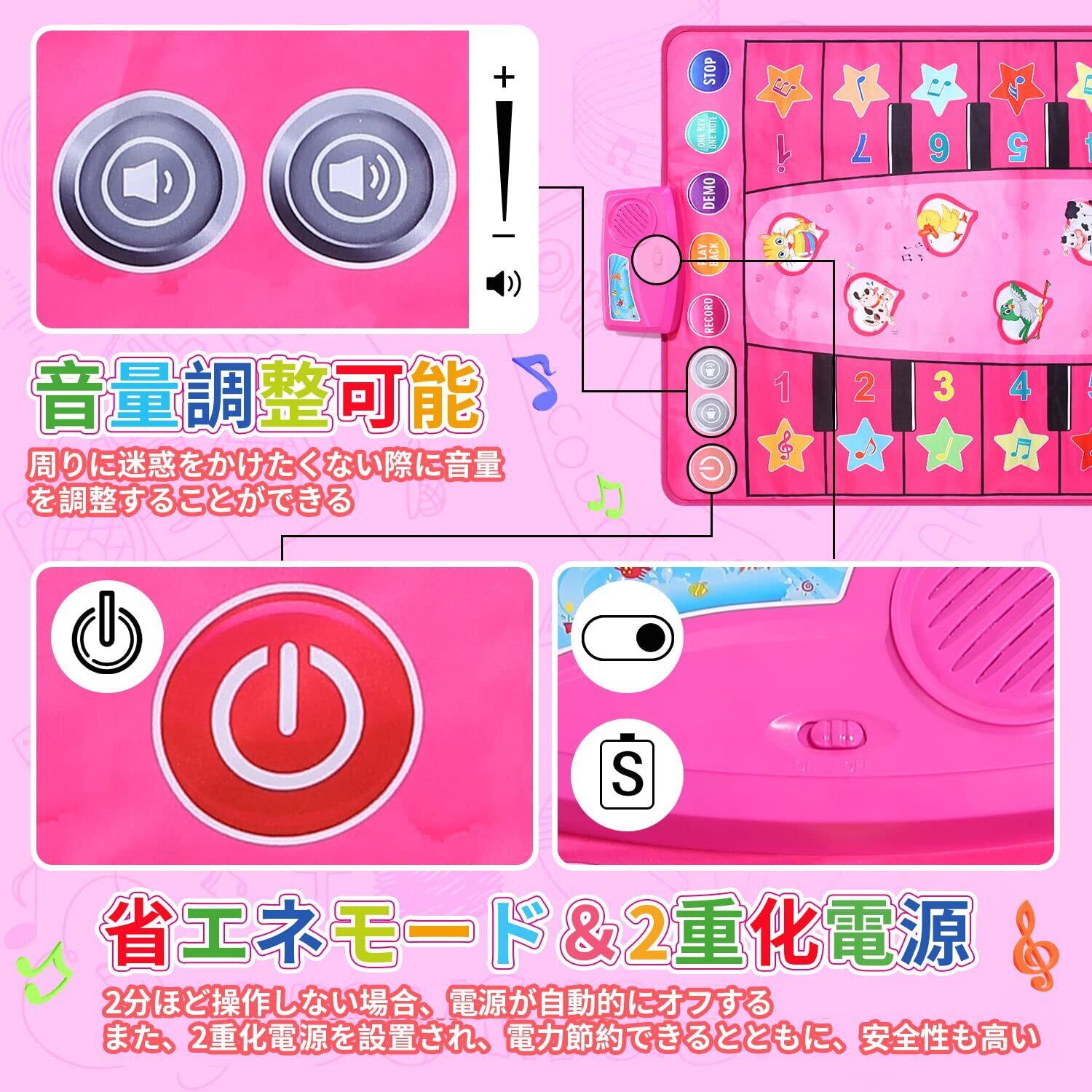 【2重化電源&自動オフ省エネモード】電池ボックス電源とピアノマット電源、2重の電源が搭載されています。まず電池ボックスの電源を入れたあと、またピアノマットの電源をオンにすると使えます。また、2分ほど操作しない場合、電源が自動的にオフします。安全性が高いとともに、電力節約も一つのメリットとなります。
