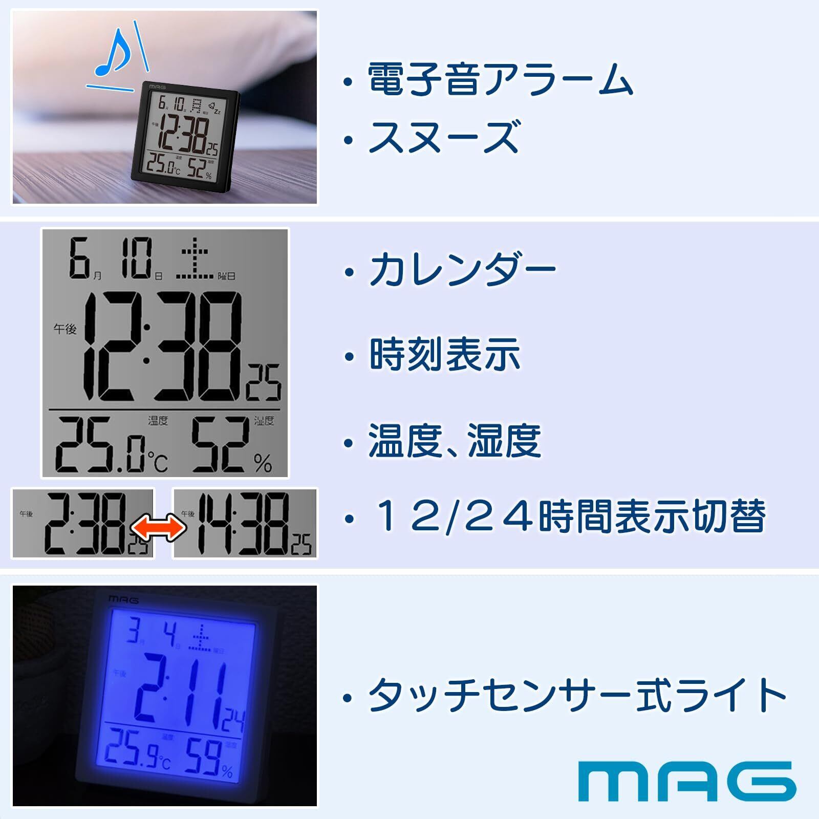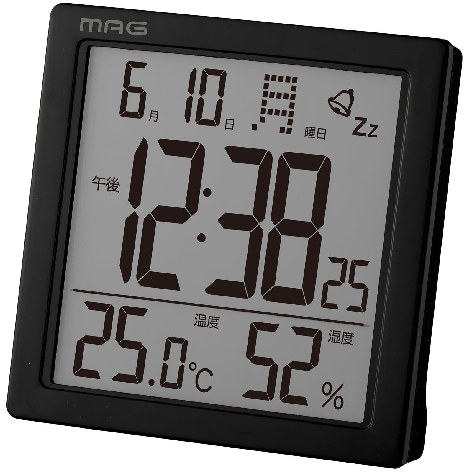 MAG(マグ) 目覚まし時計 置き時計 デジタル 温度計 湿度計 温湿度計 カレンダー 電子音 アラーム スヌーズ ライト ブラック カッシーニ AT-726 BK-Z ノア精密
