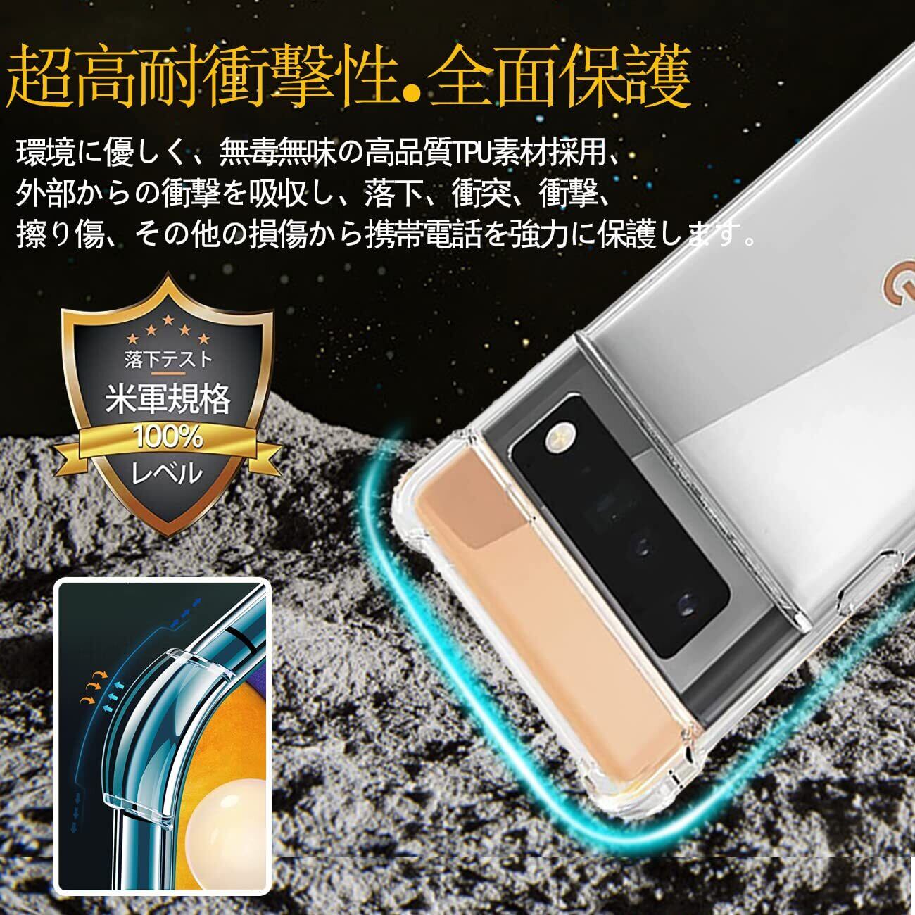 【360軍用グレードの保護、高い耐衝撃性】 本製品は Google Pixel6 Pro に対応する透明ケースです。外側のシェルは高い耐黄い耐性を備えた最先端技術ADMを採用しております。しかも環境にやさしく、無毒で無味の高品質の素材を使用して、酸化防止処理しており、長年でも黄色くなりません。多数回のテストした後、2mの高さで様々な角度から26回落としましたが、携帯電話が全然傷がありませんでした!更に四隅の耐衝撃性は通常の携帯電話ケースの5倍に達し、携帯電話を全面的に保護できます。(ご注意:ご購入前機種をよくご確認くださいね。間違った機種の購入による使えないことを避けてください)