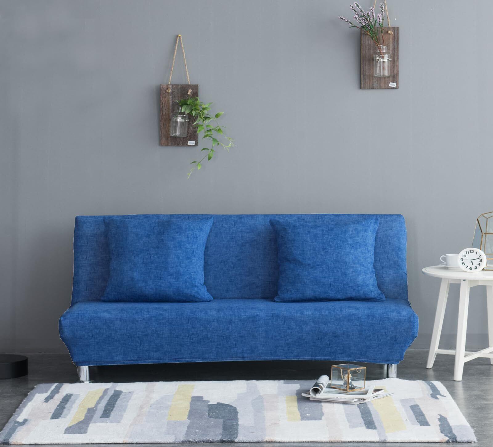 TMVOK ソファーカバー 2人掛け 伸縮素材 ソファベッドカバー 肘なし 柔らかい 犬 猫 傷 防止 クッションカバー2枚付 収納便利 四季通用 幅160-190cm(ブルー)