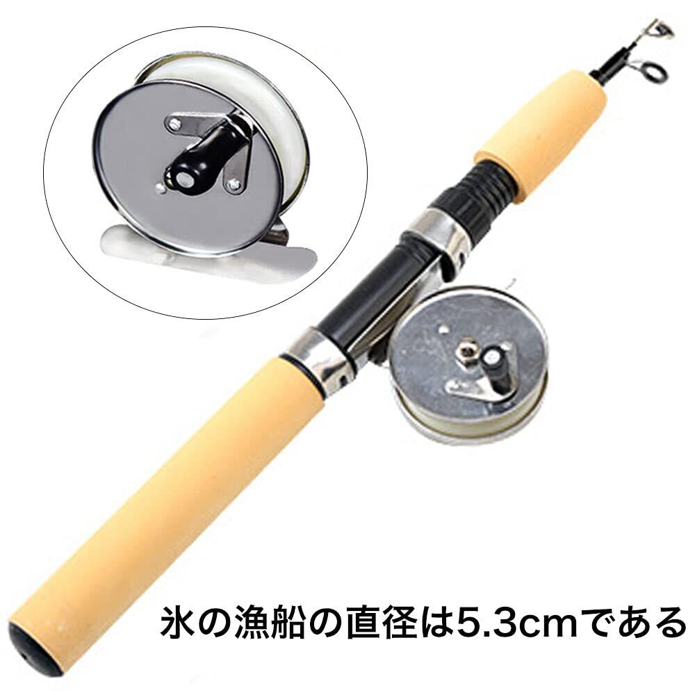 【素材】穴釣り ロッド先端はグラス製につき、硬めで当たりを取りやすく、小さな根魚にもあわせやすい仕様となっております。氷の漁船は金属+プラスチック材料を使用し、約5.3cmのサイズである。