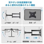 【角度が自由で見やすい】アームの左右角度調節は3か所があります。●壁側の取付け部は左右各90度で角度が調整できます。●アームとアームの接合部は壁面から40.5~406mmまで調整可能です。●テレビ取付け金具部は回転360度、上向き5度、下向き15度で角度が調整できます。視聴場所に合わせてスタイルを自由自在に、楽々テレビが楽しめます。※テレビのサイズにより角度調節範囲は変化する場合があります。