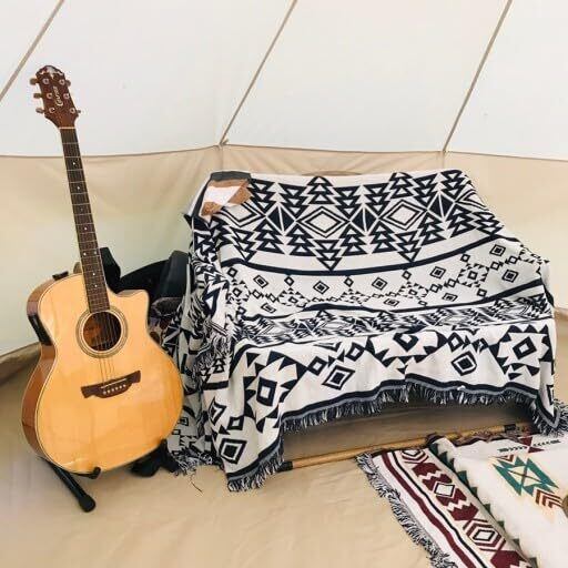 大判のメキシカンラグをコットの上に敷くだけで、まるで先住民が生活しているような空間に。ナチュラルな色あいのテントやテーブルに、メキシカンラグの派手めなデザインがマッチしています。
