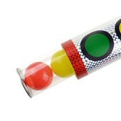 透明の筒に筒を被せ、上から緑、黄、赤の順にボールを入れていきます。