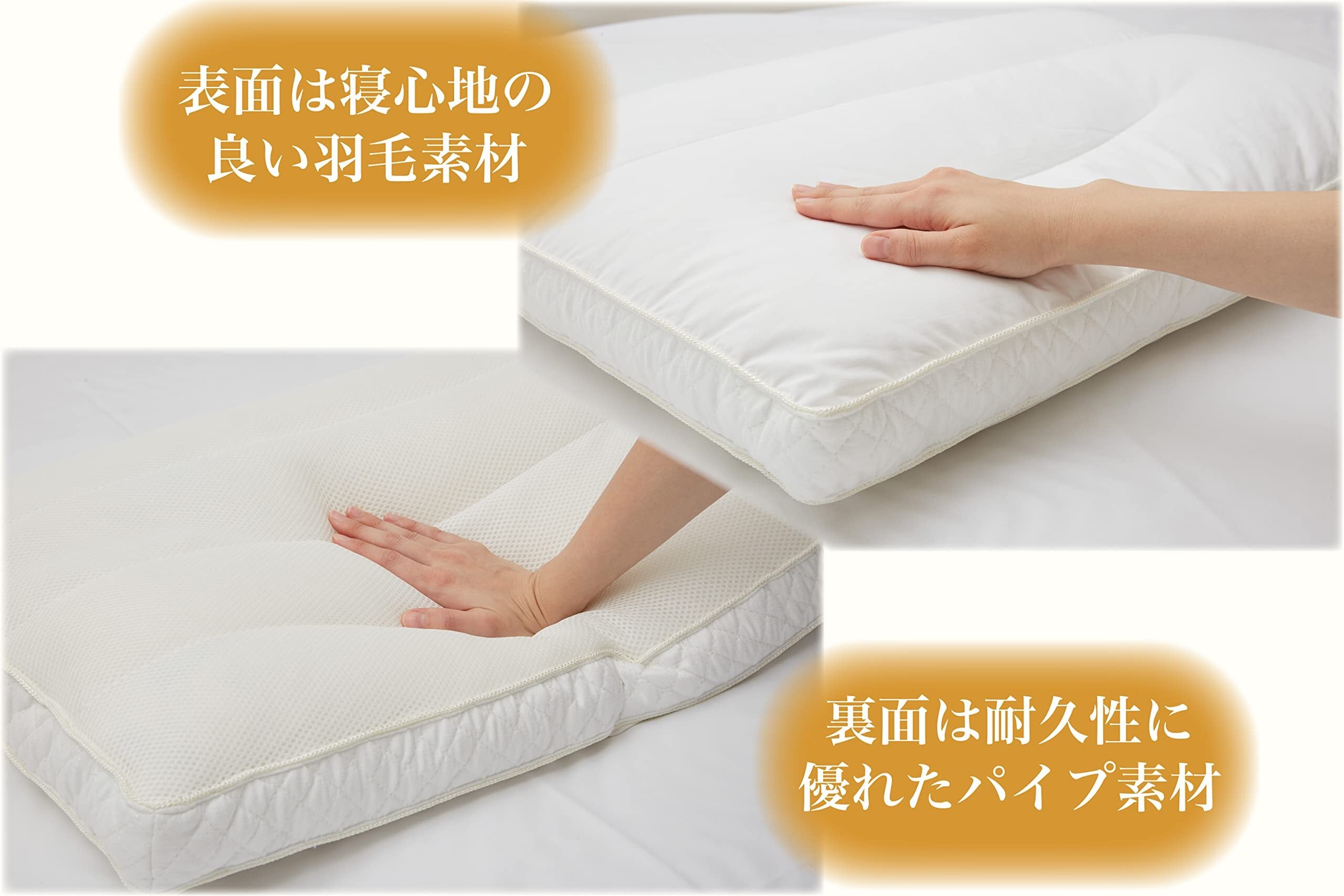 【好みや体調に合わせて寝心地を選べる4way仕様】表面は寝心地の良い羽毛まくら、裏面は通気性と耐久性に優れたパイプまくらとなっており、その日の体調・気分やお好みに合わせて寝心地を選べます。位置によって「高め」と「低め」を選べます。また、表面は肌触りの良い綿100%生地を採用し、裏面は蒸れにくく快適なメッシュ構造のため、季節に併せて調整も可能です。マチ付きなので、型くずれしにくく”ふんわり”使えるのも特徴です。