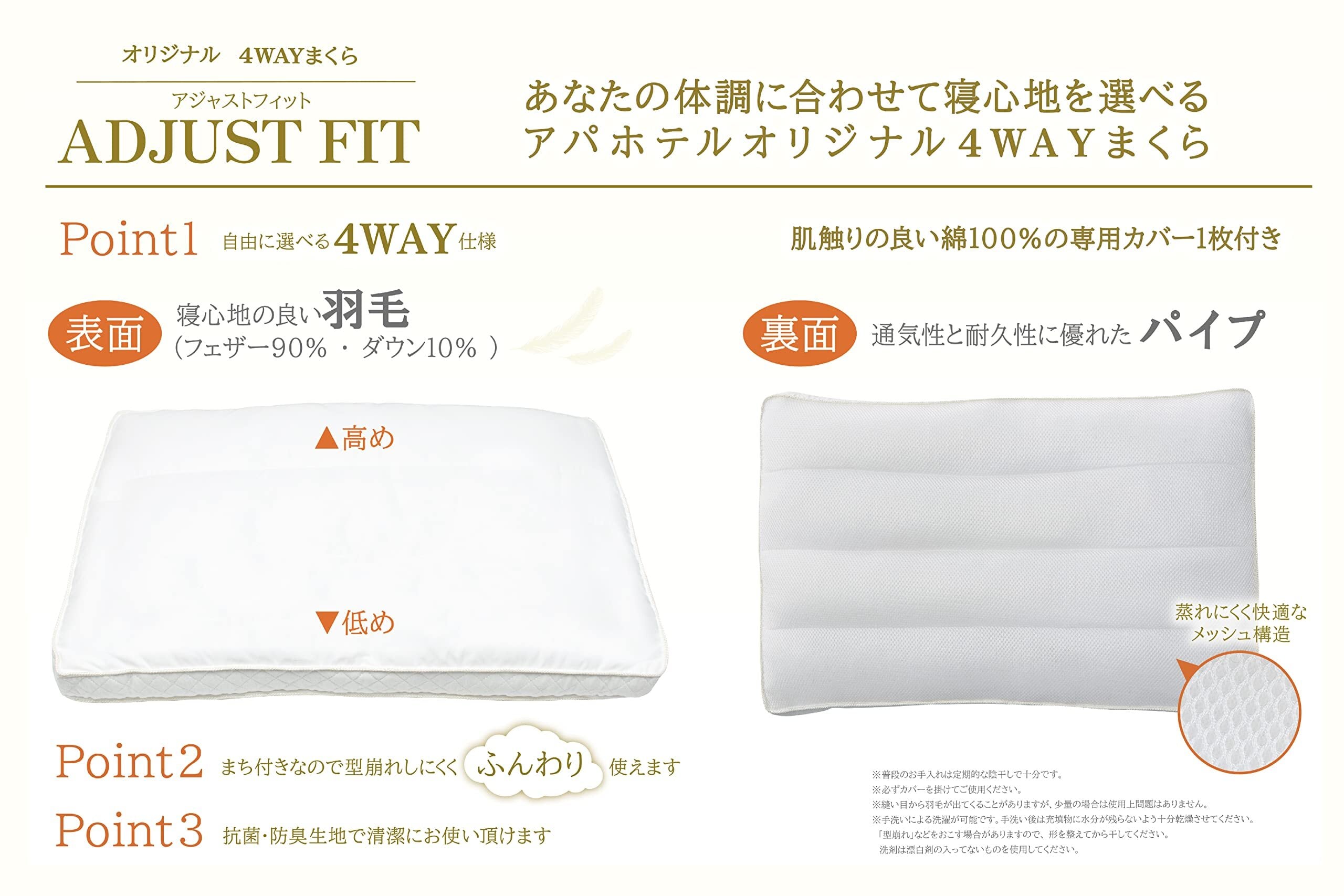 アパホテル 枕 ADJUSTFIT (アジャストフィット) APA オリジナル 4way まくら 羽毛枕 パイプ 安眠枕 高反発 ホテル枕 快眠 横向き寝 対応 丸洗い可能 枕カバー付き