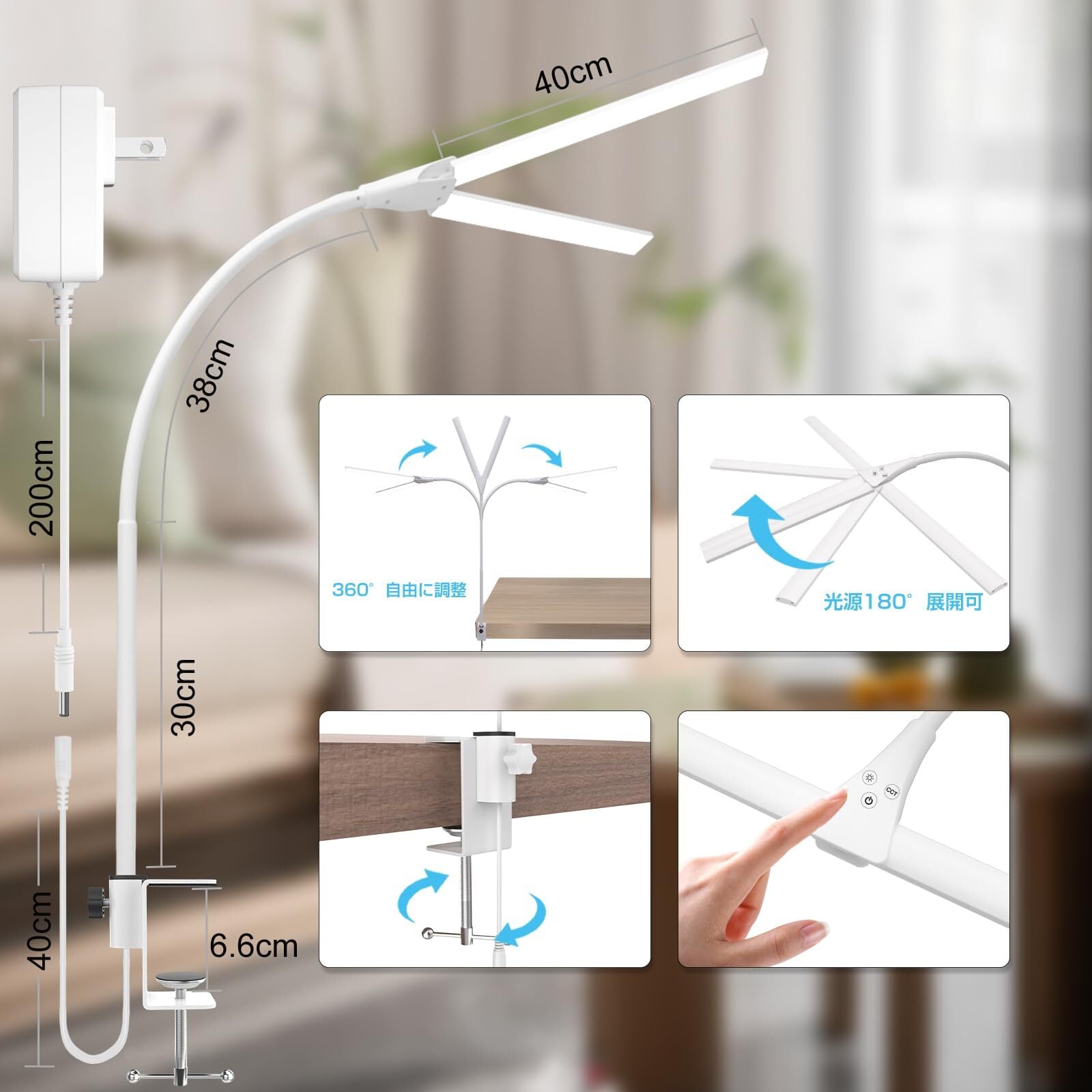 【クランプ式・省スペース・角度調整可】場所を取らないクランプ式のテーブルライト、教科書や参考書をたくさん広げる人や机が狭い人でも広々と作業できます。(クリップ挟める厚さ:6cmまで)。照らす位置を調整しやすい、グースネックデザイン、任意の角度に調整可能、ライトの設置場所を変えずとも照らしたい場所を照らせます。