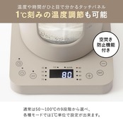 温度設定:45~100度(1度刻み)、登録温度:50、60、70、75、80、85、90、95、100度、保温時間:1~6時間(1時間単位)、自動保温15分、予約モード:最大24時間(30分~24時間まで、10分単位で設定可能)、空焚き防止機能