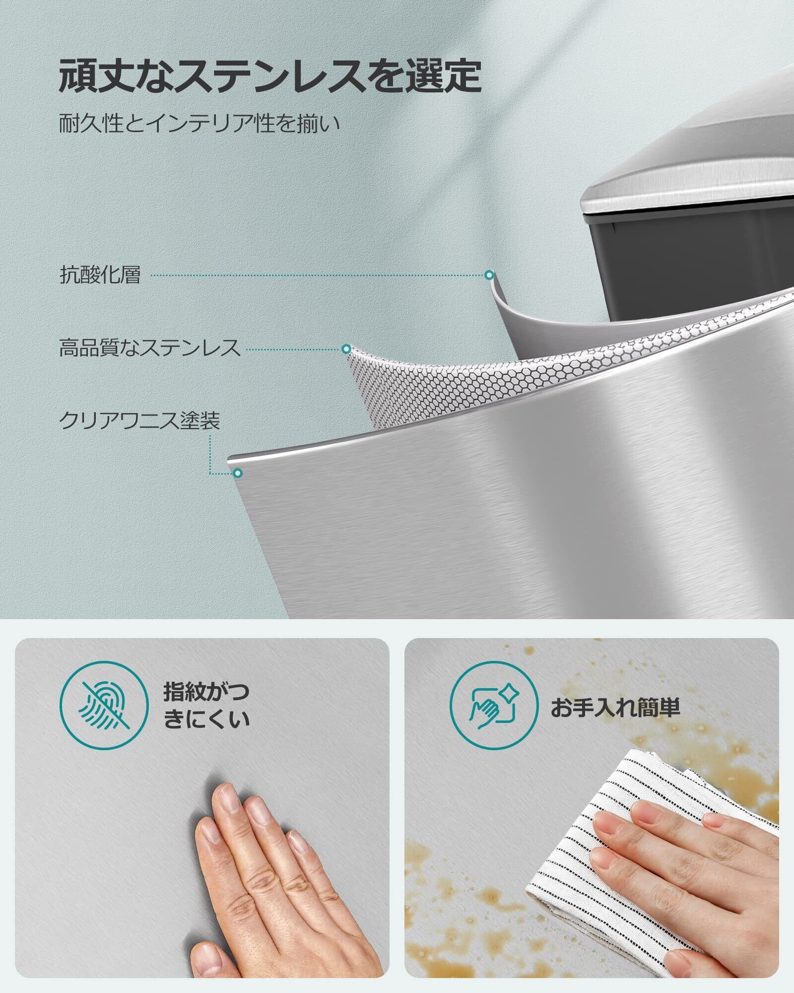 【お手入れ簡単&上品な見た目】ゴミ箱表面に指紋防止のコーティングを施しており、手で触れても指紋がつきにくくなっています。防水でさびにくく、汚れがあってもサッと拭くだけで簡単にお手入れできます。光沢あるステンレスを使用し、スタイリッシュでシンプルなデザインもそろい、インテリアの一つとしても違和感がありません。