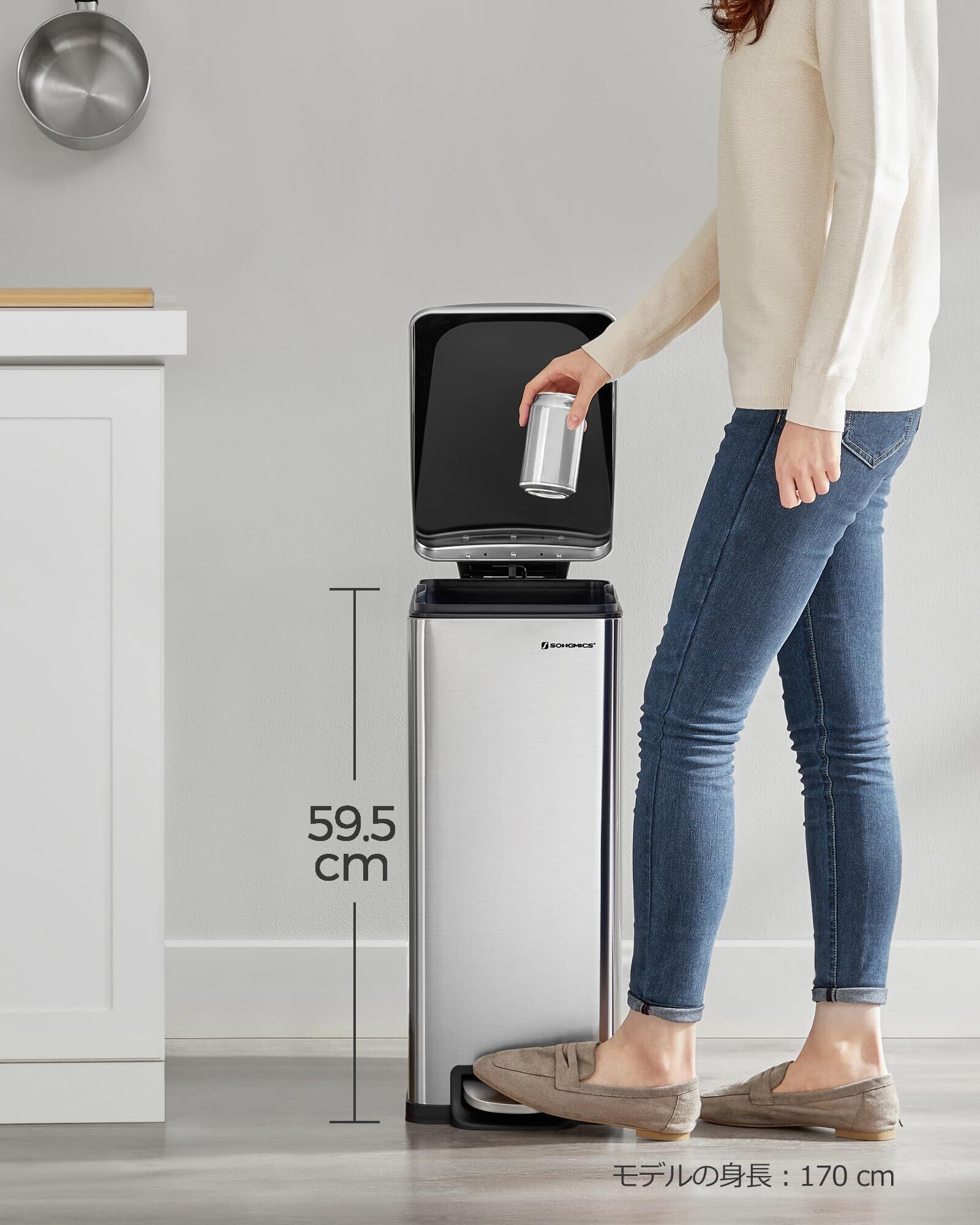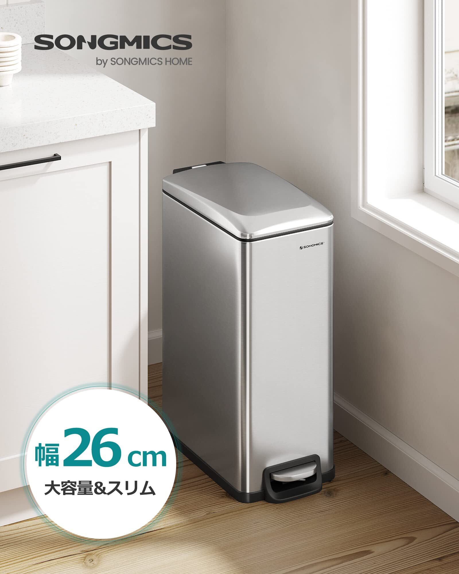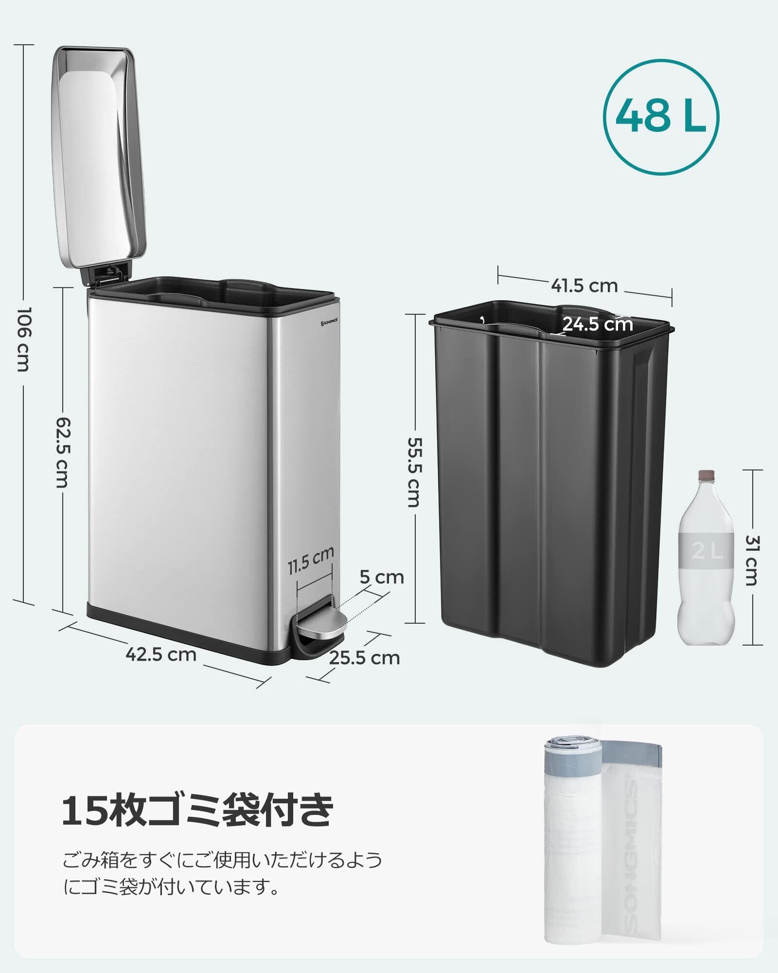 SONGMICS ゴミ箱 ふた付き ペダル式ダストボックス 48L大容量 スリム ステンレス製 においが漏れない キッチン/リビング用 ゴミ袋付き LTB510E48
