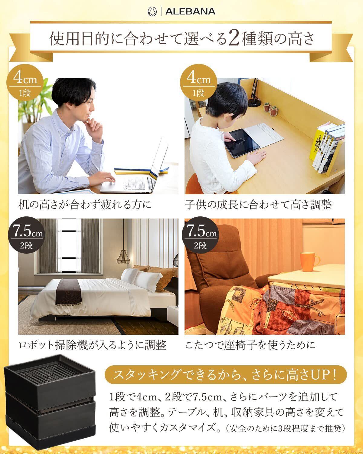 ALEBANA 高さ調整 机 こたつ 角足 継ぎ足し テーブル 高さ調節 ベッド 座椅子 ソファ の 脚 を 高く する 便利グッズ (高さ4cm(1段), ブラック)
