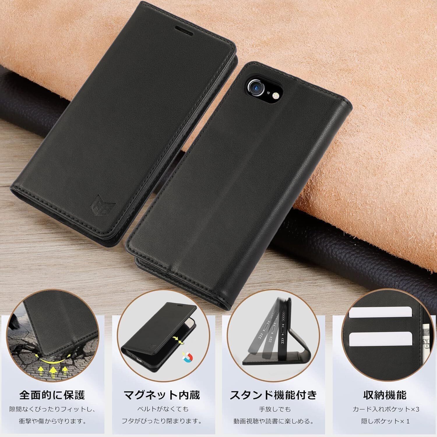 FeeY iphone se 第3世代 手帳型ケース se 2020 ケース手帳型 iPhone8 ケース iPhone 7 手帳 iPhone se3 スマホケース カード収納 横置きスタンド機能 TPU素材 衝撃吸収 全面保護 iPhone 7/8/SE2 /SE 2022 4.7インチ対応 ,ブラック