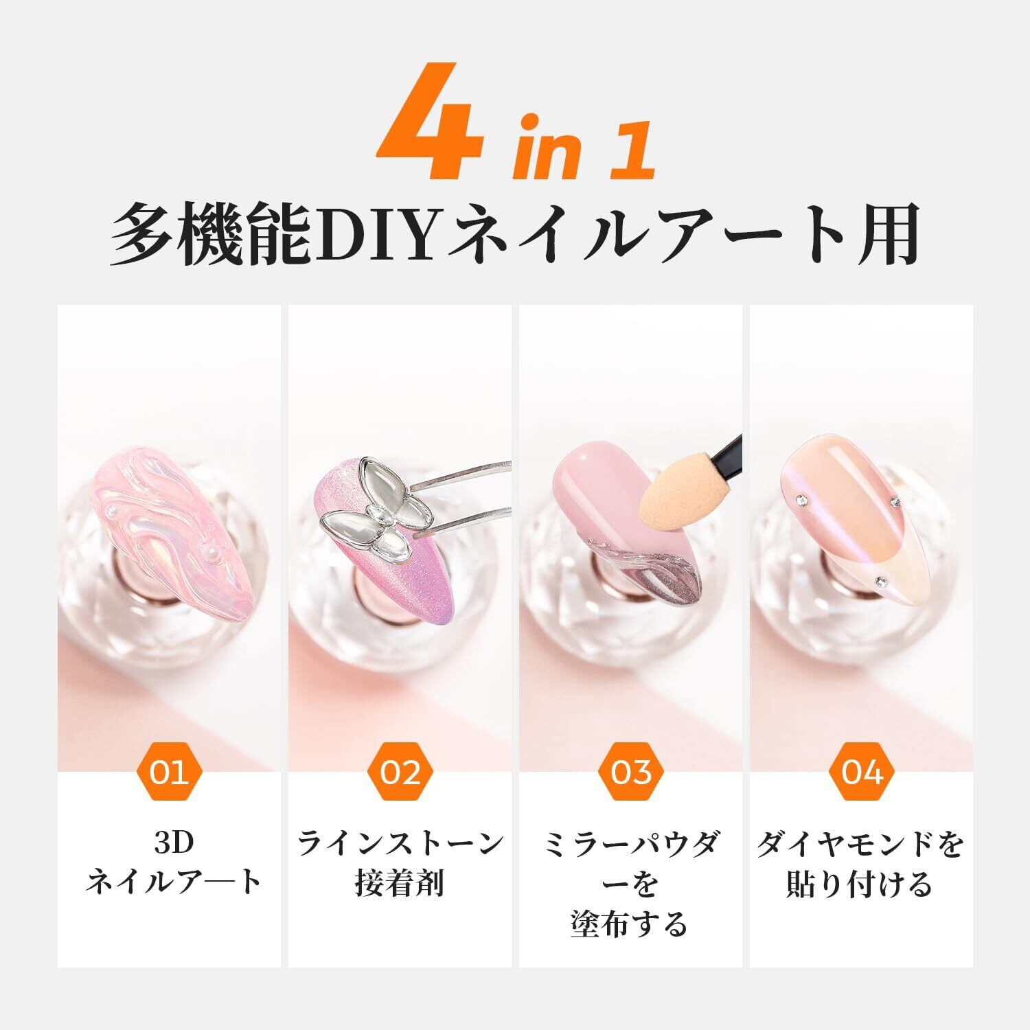 多機能グミジェル: TOMICCAネイルグルージェルは、ネイルチップを貼り付けたりるだけでなく、3Dネイルをしたい形状にピンチすることもできます。適用対象3Dネイルアート、ラインストーン接着剤、ネイルチップ接着剤、付け爪、人工爪と天然爪の間の隙間を完全に埋めて密閉します。