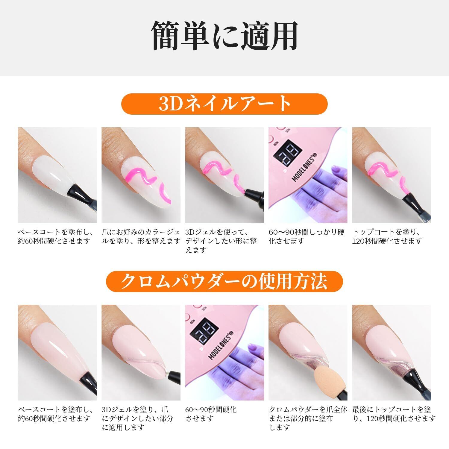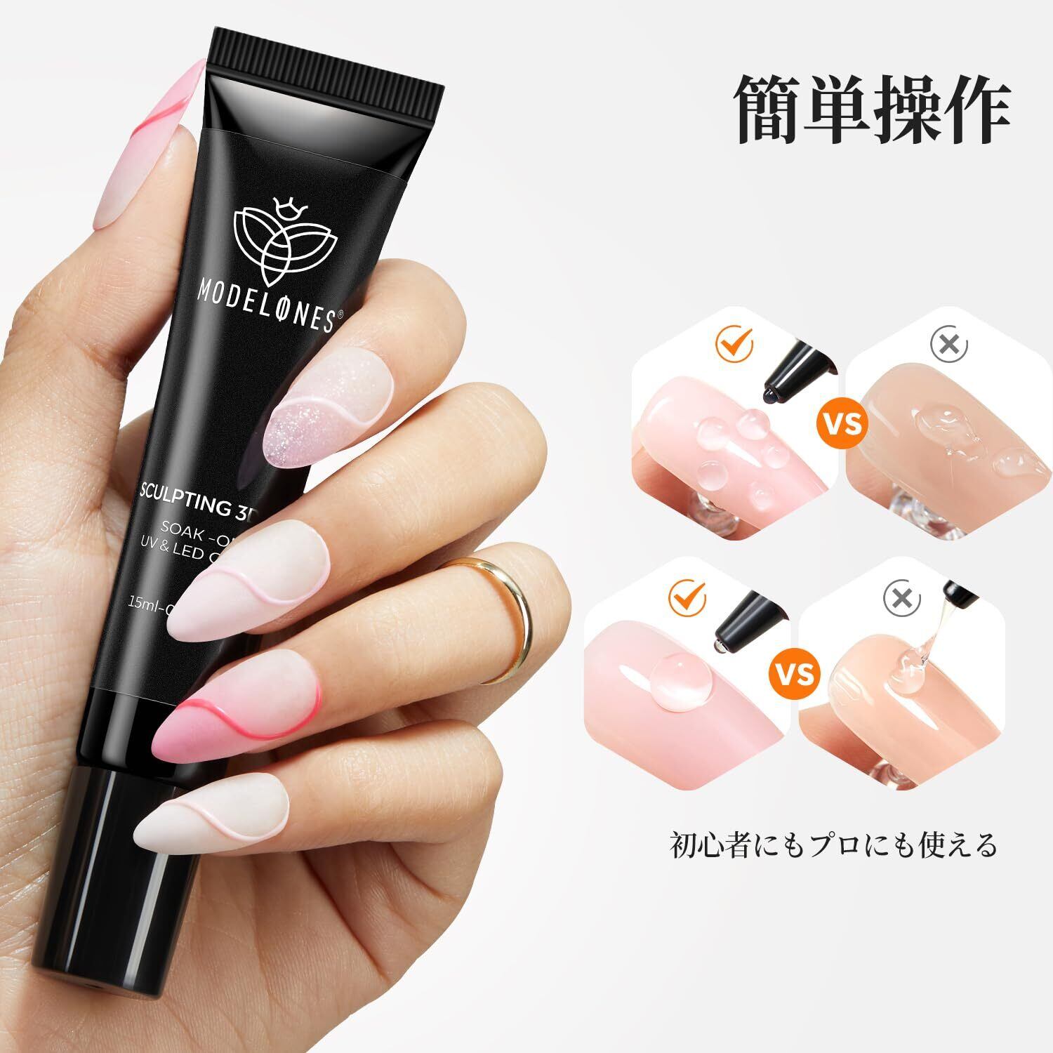 硬化が必要:MODELONES クリア ジェルネイルグルーをネイルチップに塗布し、爪に貼り付けた後、乾燥してしっかりと貼り付くまでネイルランプの下で 60 秒硬化する必要があります。